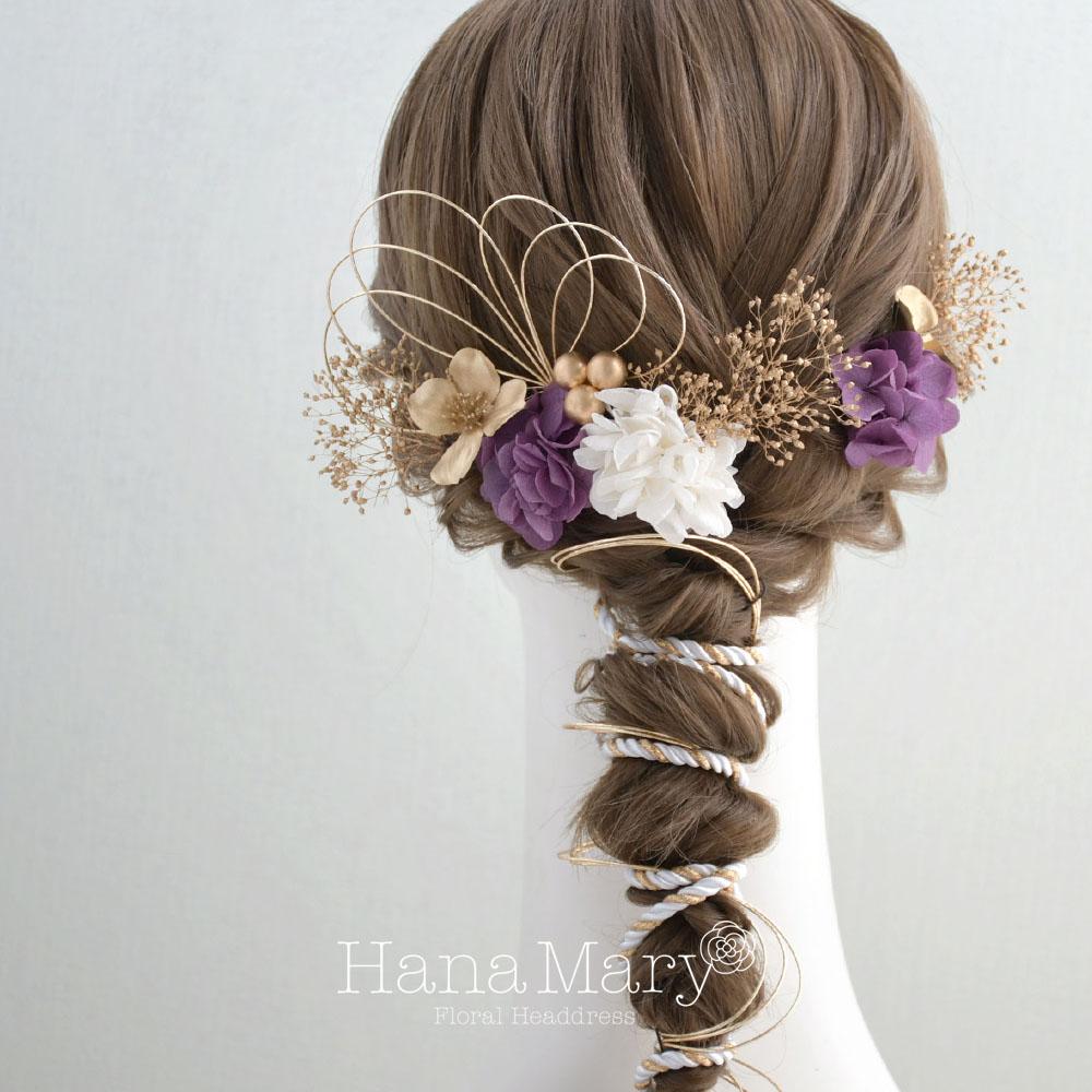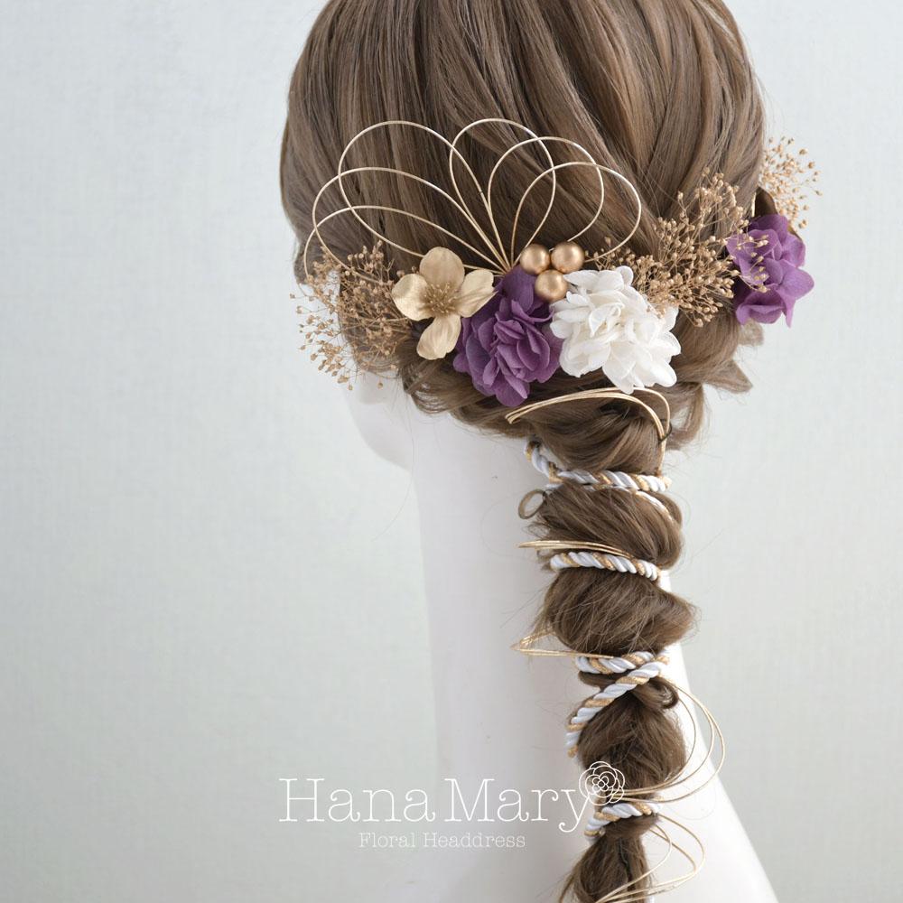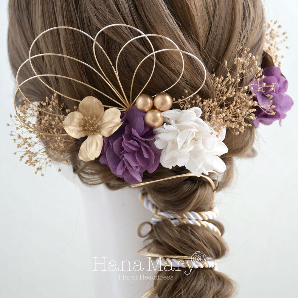 髪飾り 成人式 卒業式 振袖 袴 水引き 紫 ドライフラワー【ゴールドかすみ草】結婚式