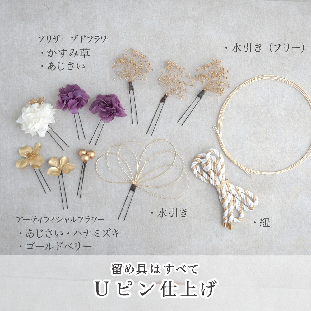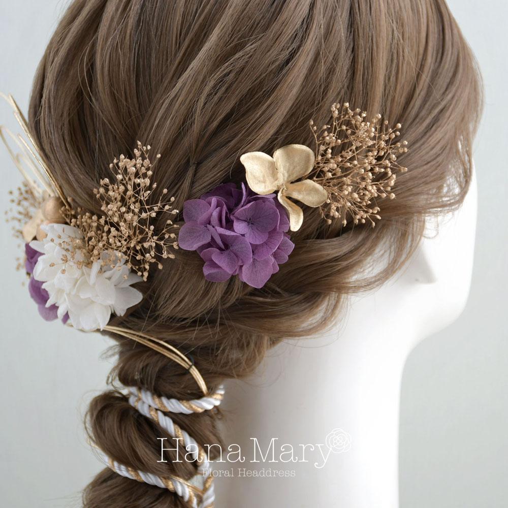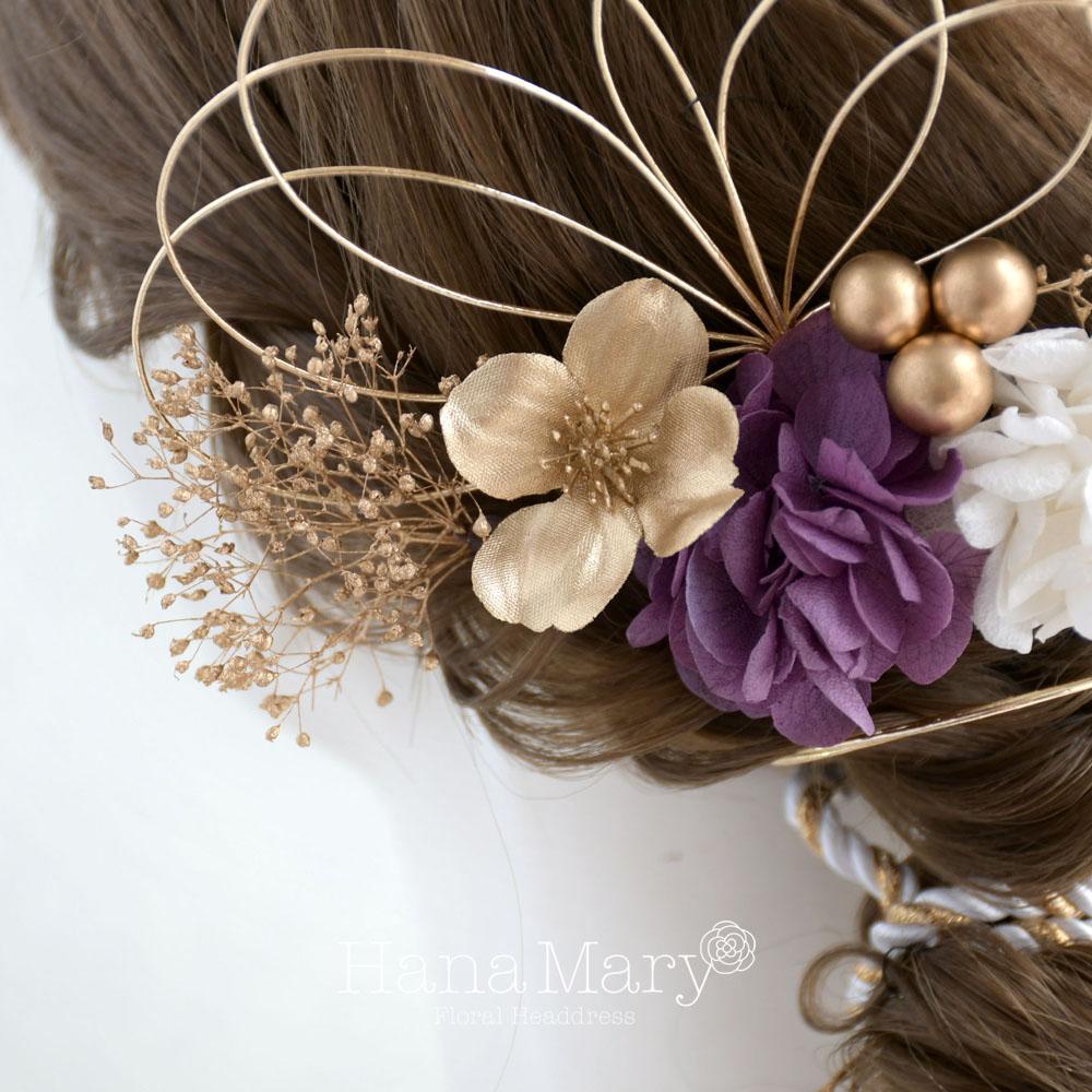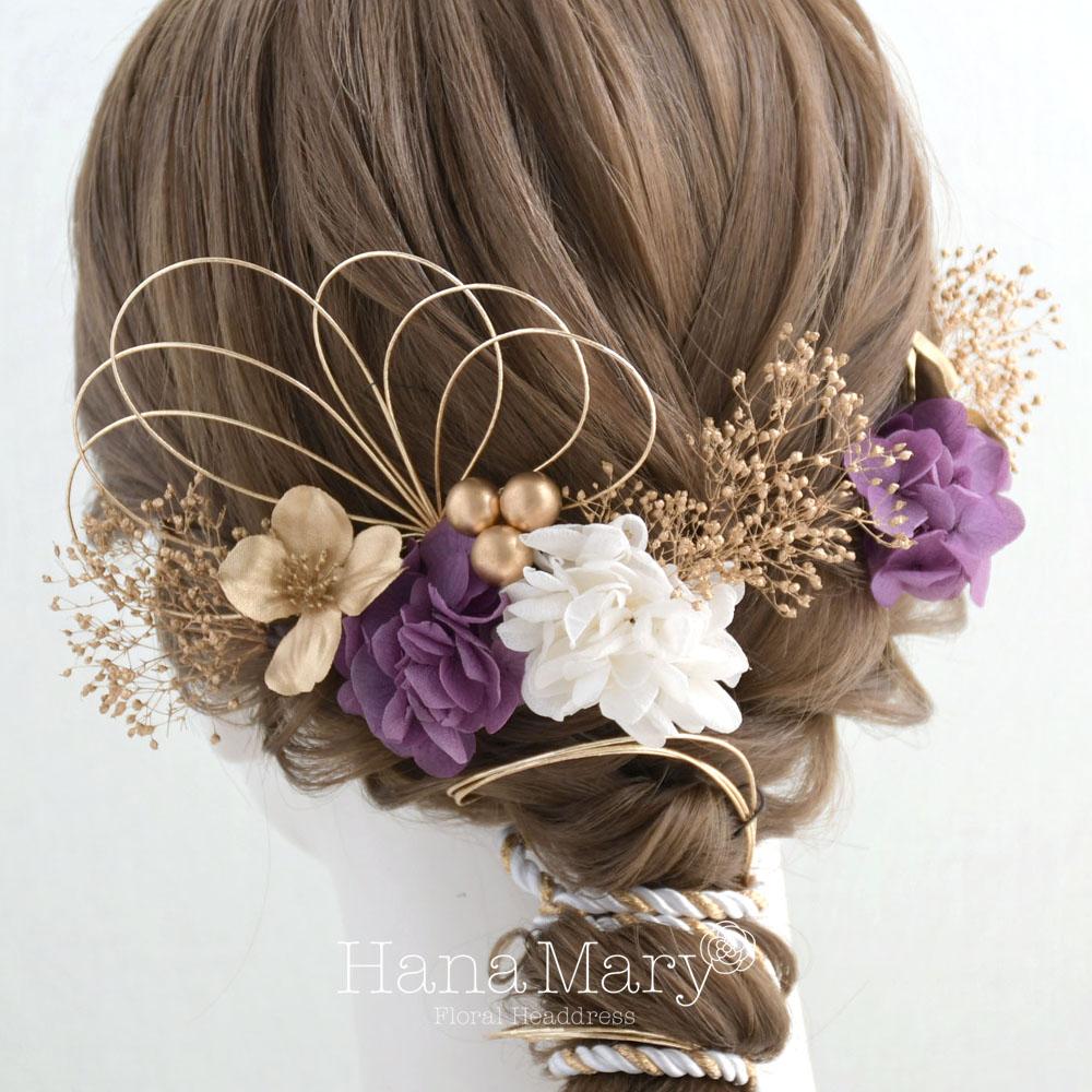 髪飾り 成人式 卒業式 振袖 袴 水引き 紫 ドライフラワー【ゴールドかすみ草】結婚式