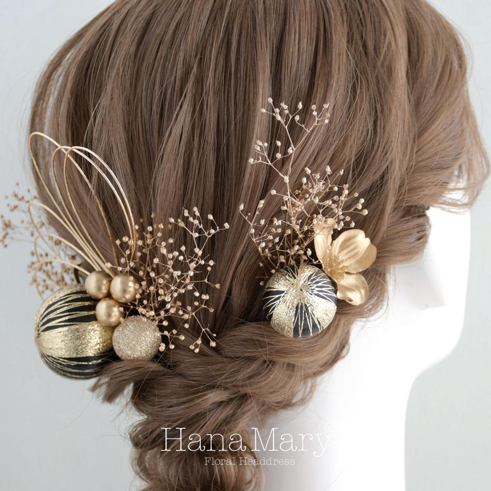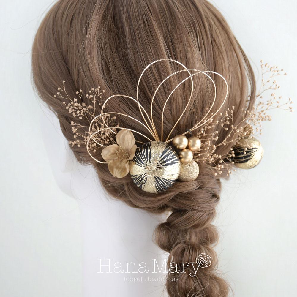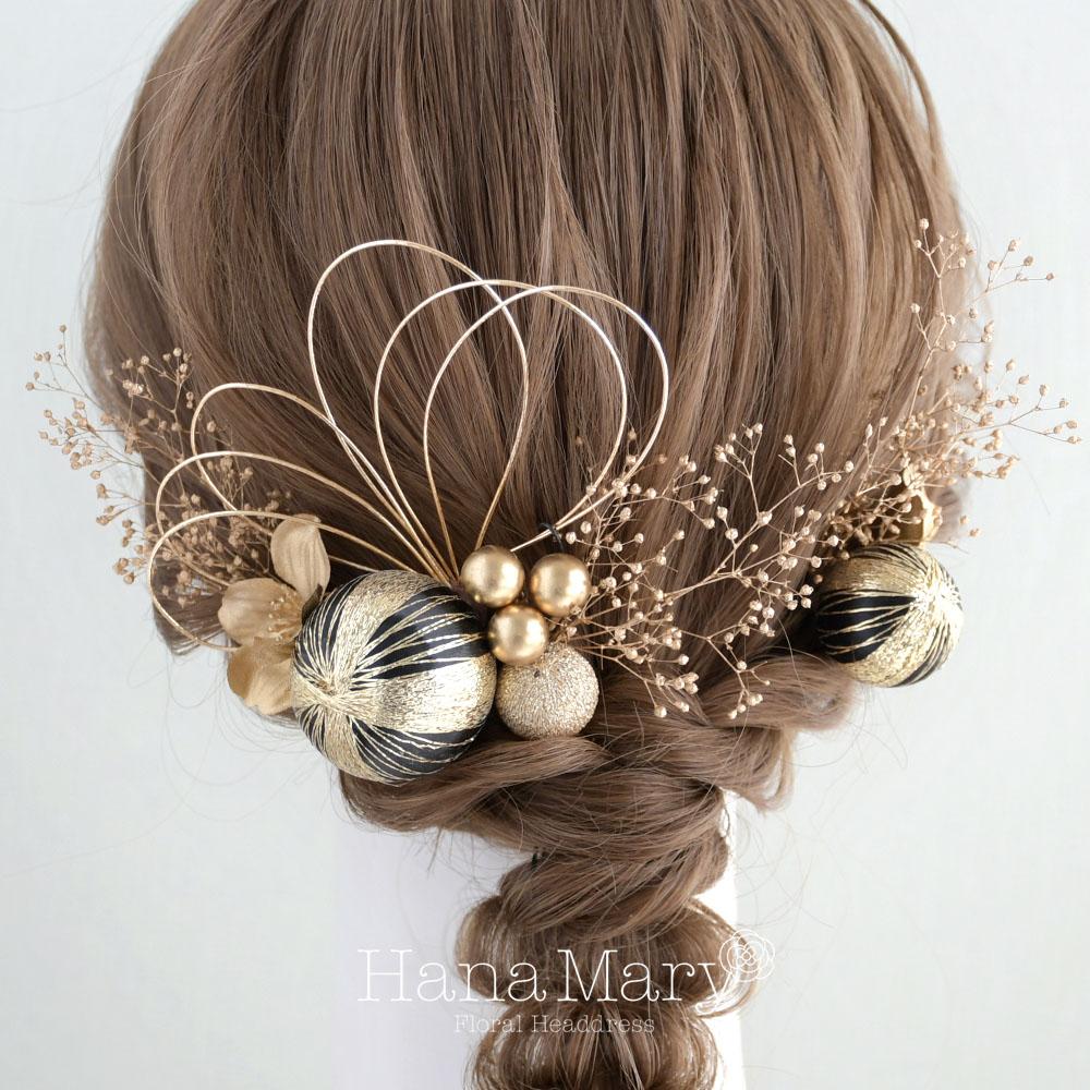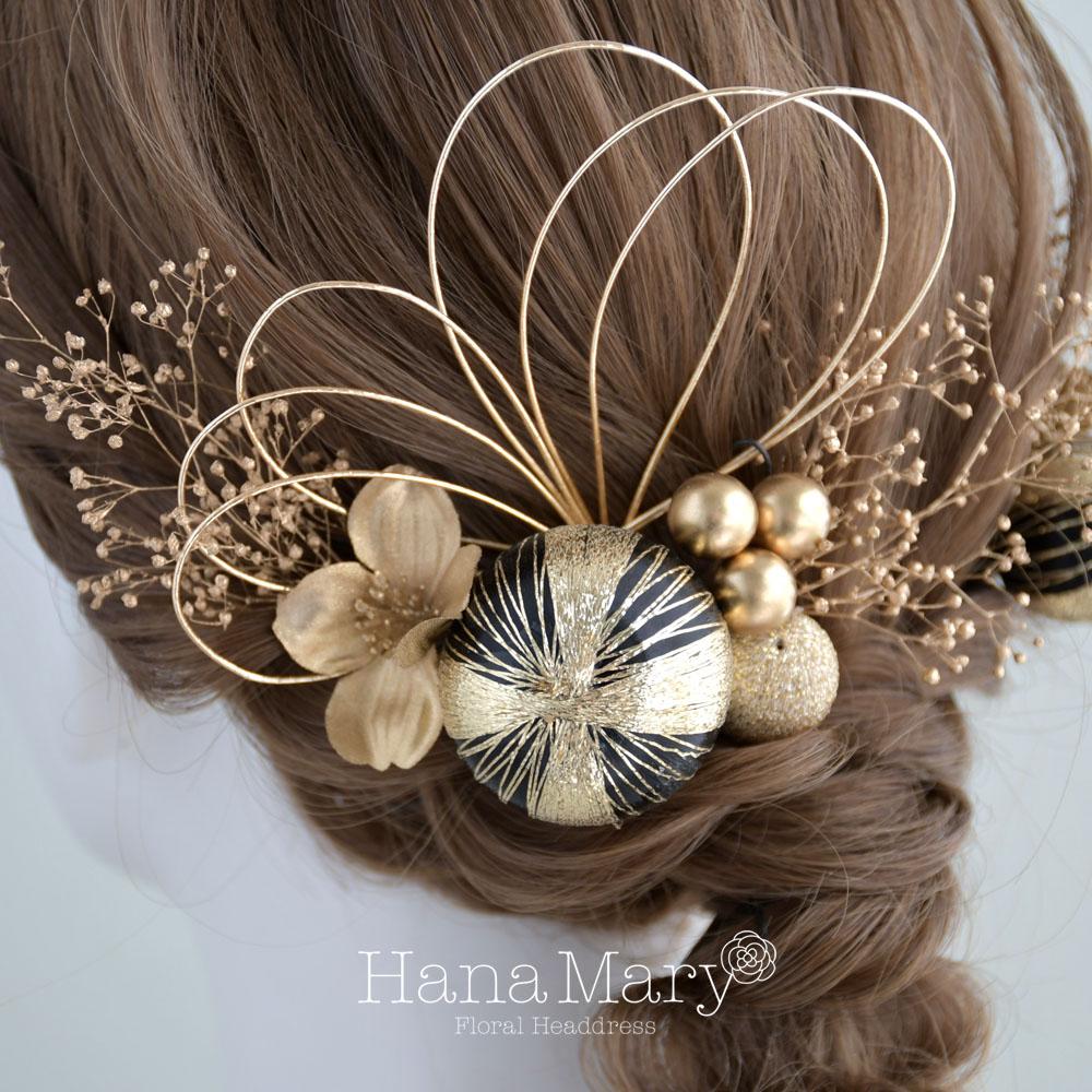 ゴールドな髪飾り【黒ゴールド】成人式 卒業式 和玉 鞠玉 水引き 振袖 袴 髪飾り