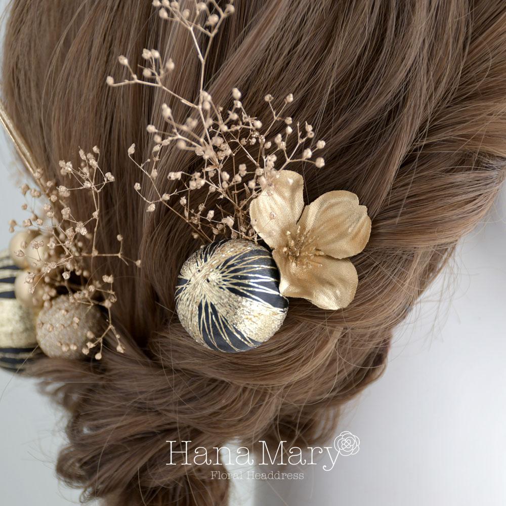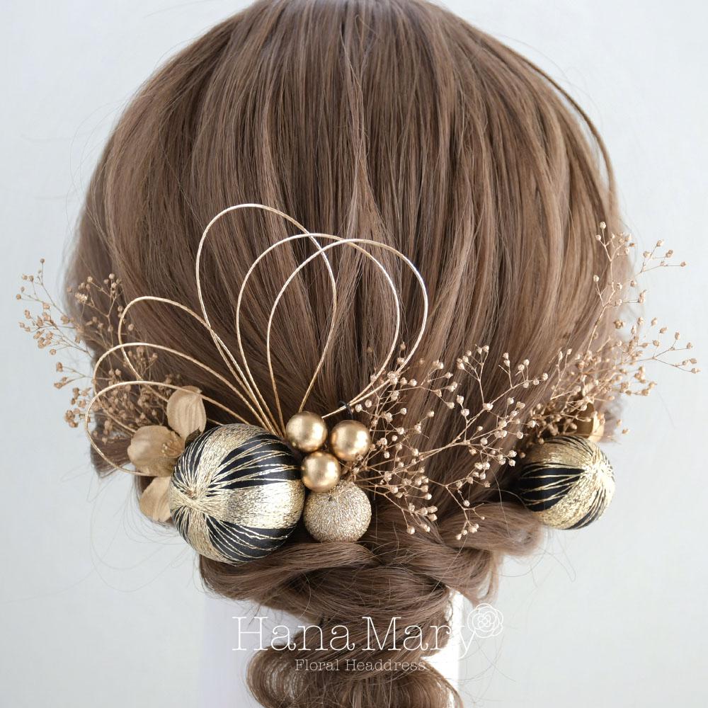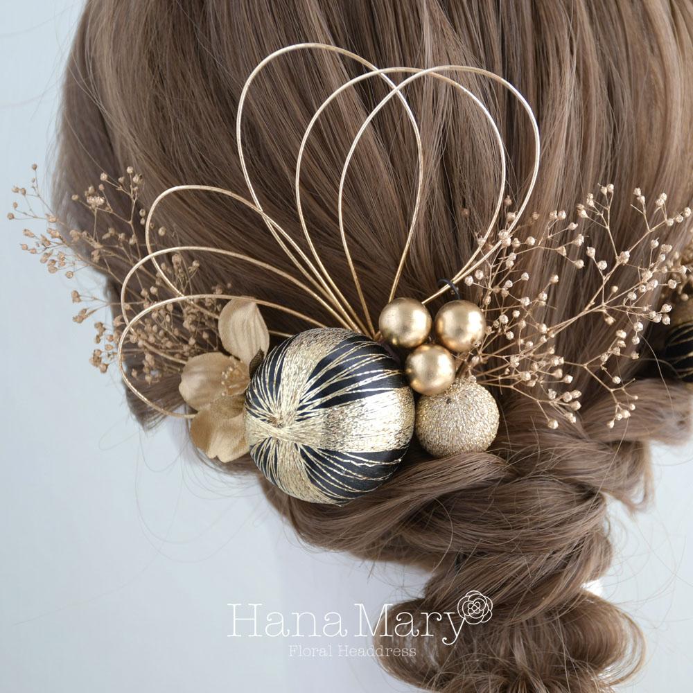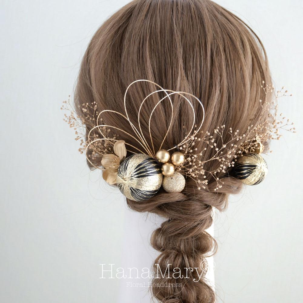 ゴールドな髪飾り【黒ゴールド】成人式 卒業式 和玉 鞠玉 水引き 振袖 袴 髪飾り