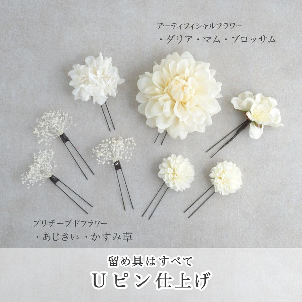 その日のヘアスタイルによって自由に一輪一輪配置できます。お花の数が多い場合でも、アメピンを追加して簡単にしっかりと固定できます。