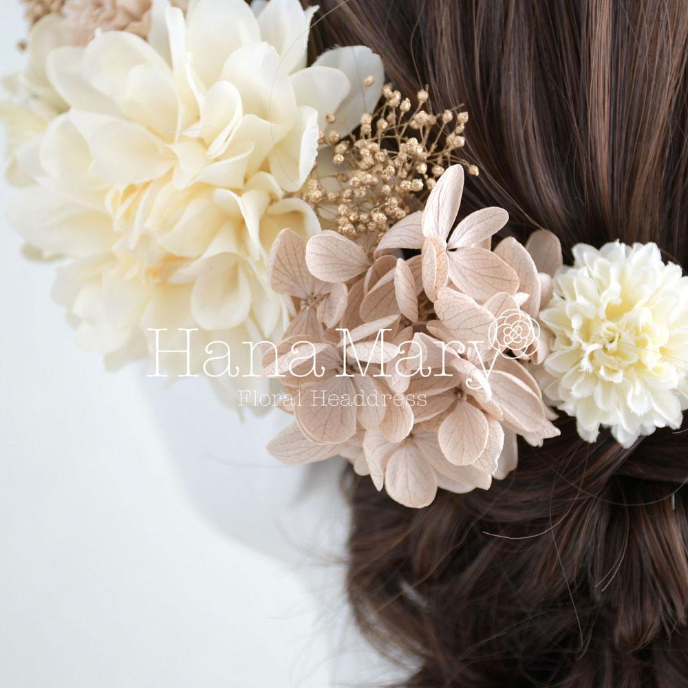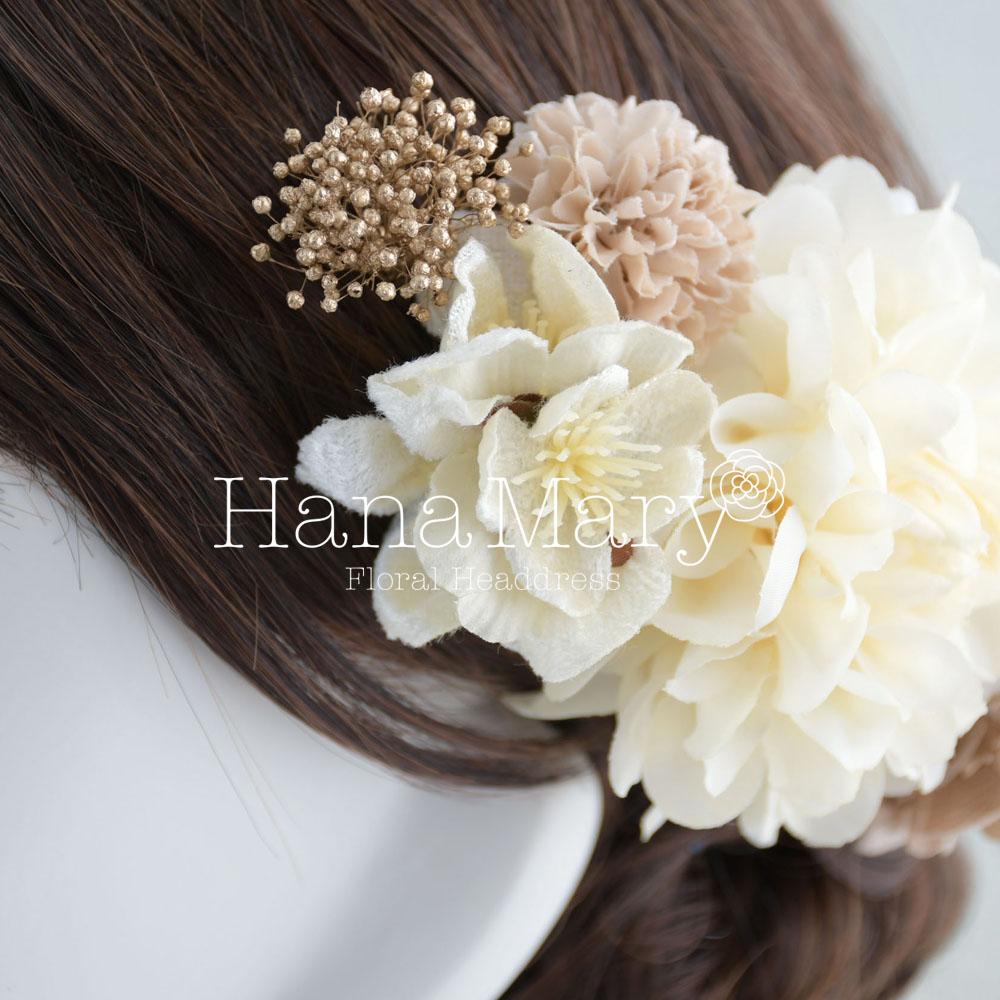 HanaMaryの髪飾りは生花をリアルに再現したアートフラワーと呼ばれるハイクオリティーな造花を使用しています。耐久性に優れ、成人式・卒業式やウェディングなどに何度でも繰り返し使用することができます。
