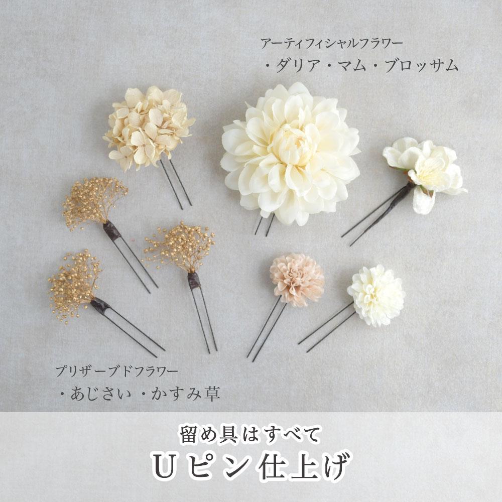 その日のヘアスタイルによって自由に一輪一輪配置できます。お花の数が多い場合でも、アメピンを追加して簡単にしっかりと固定できます。