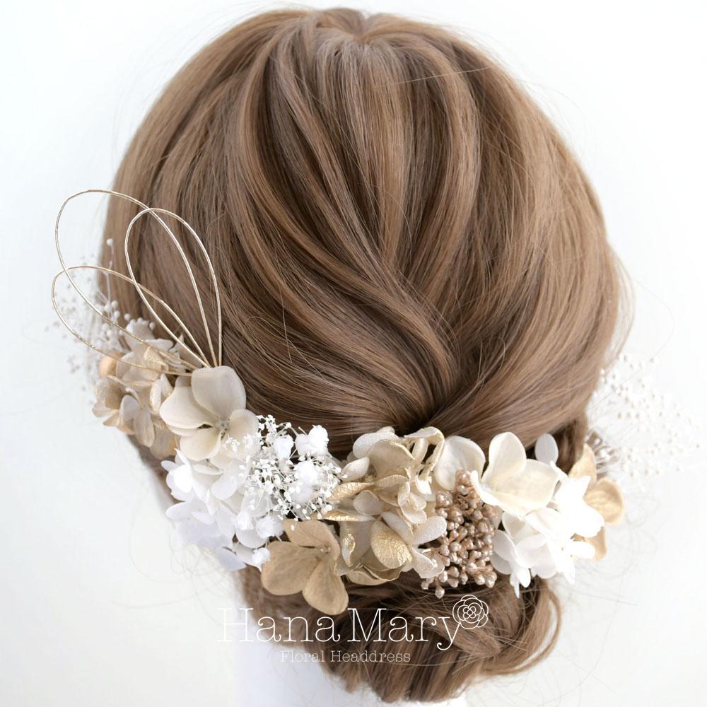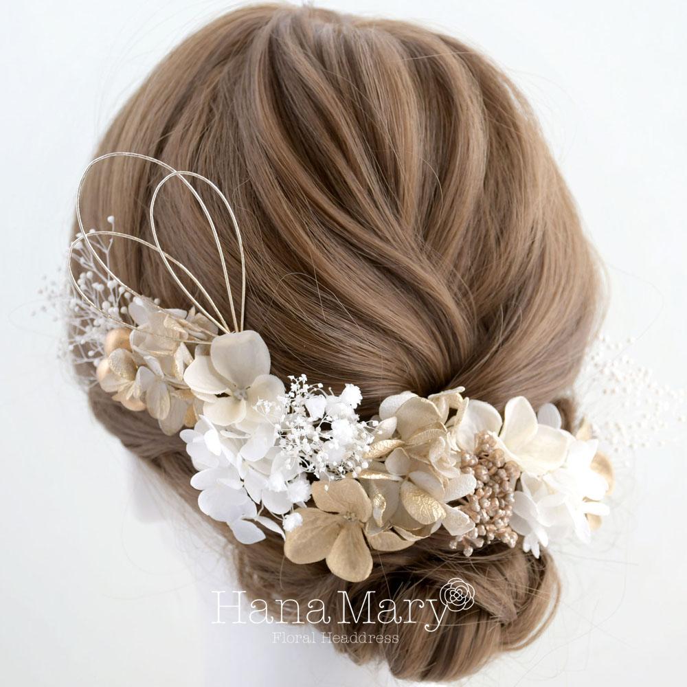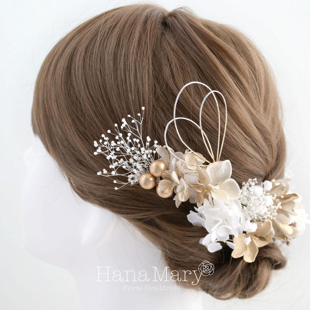 白、オフホワイト、ゴールドでシンプルに清楚に、エレガントな印象を着物コーデにプラスしてくれます。アーティフィシャルフラワーの一輪の紫陽花を可愛く散りばめ、水引きやゴールドベリーで華やかさのアクセント。祝いの式典シーンにぴったりな髪飾りです。