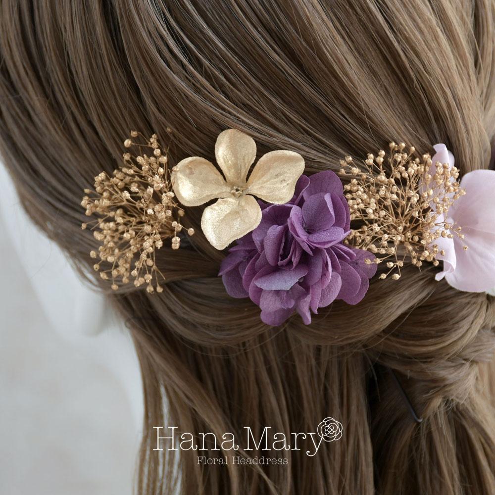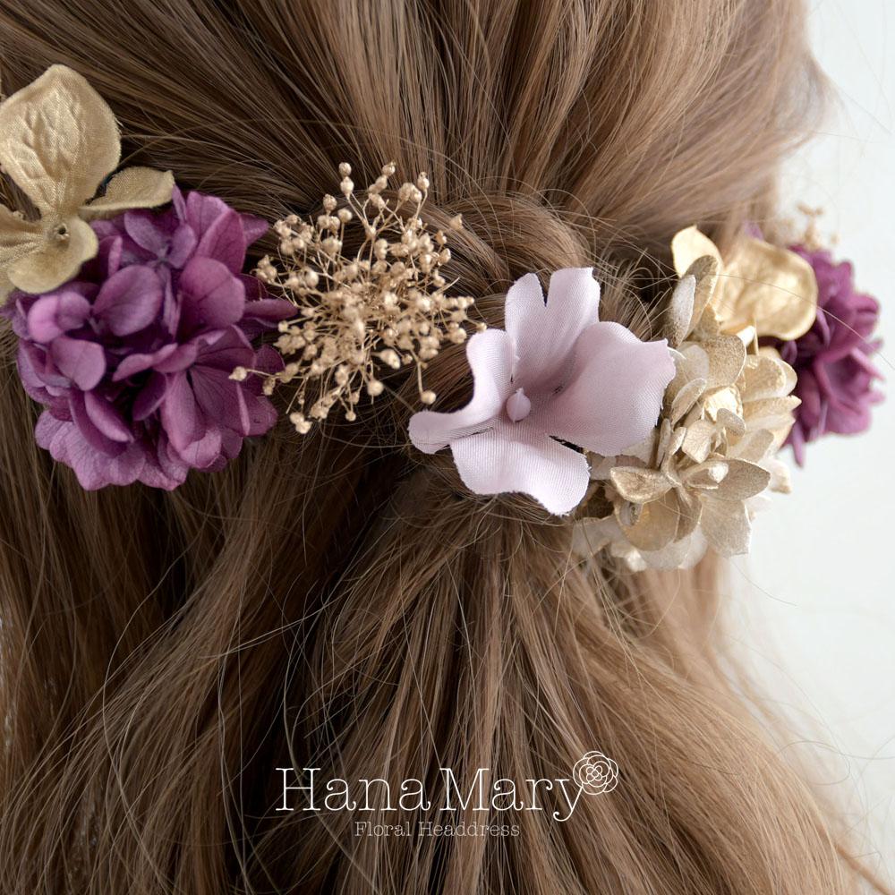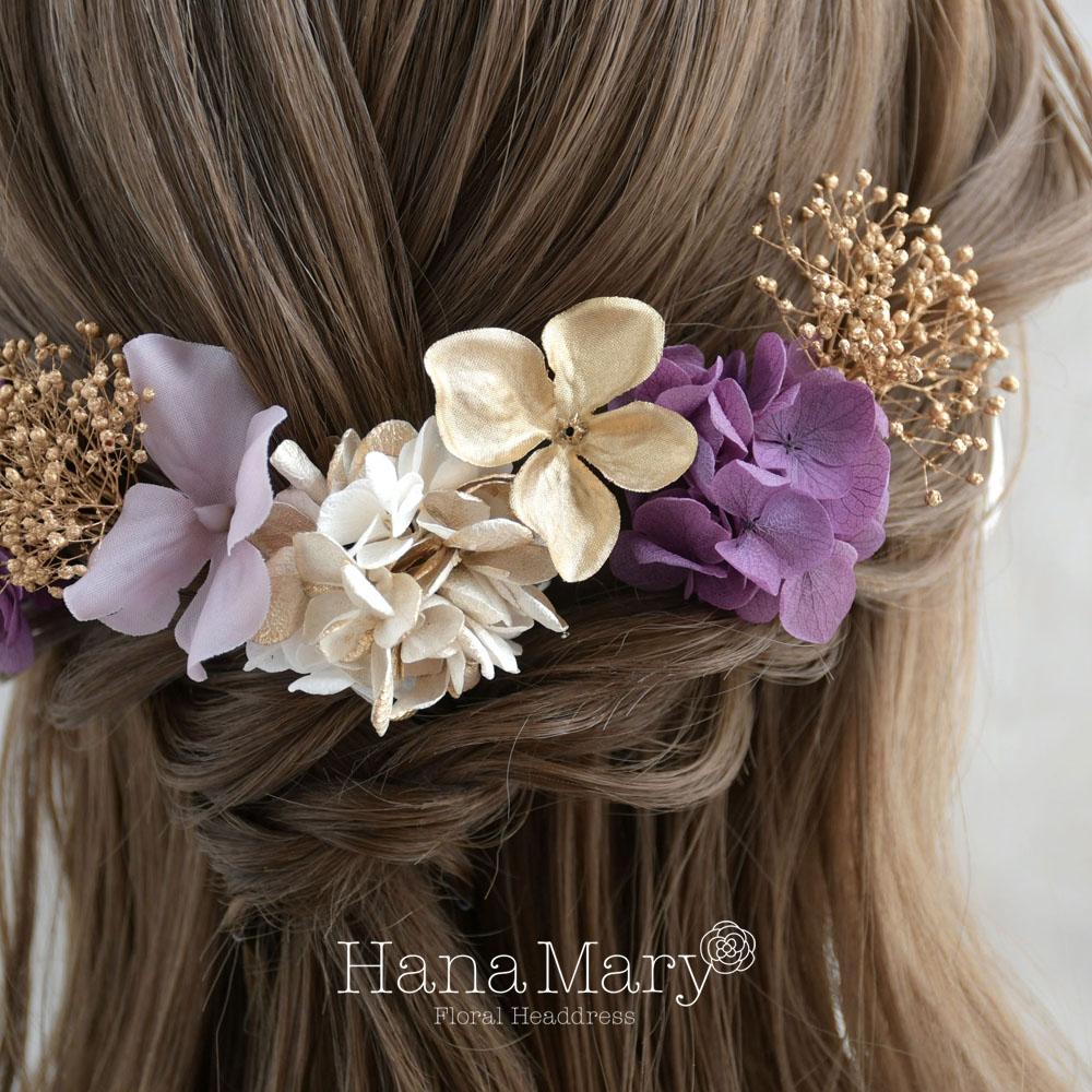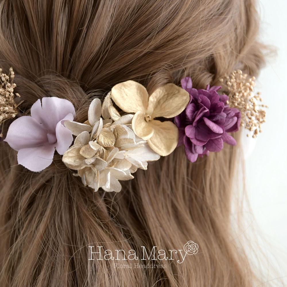 一輪の紫陽花と小花で綴る【ゴールド 紫】卒業式 成人式 結婚式 振袖 袴 髪飾り 着物