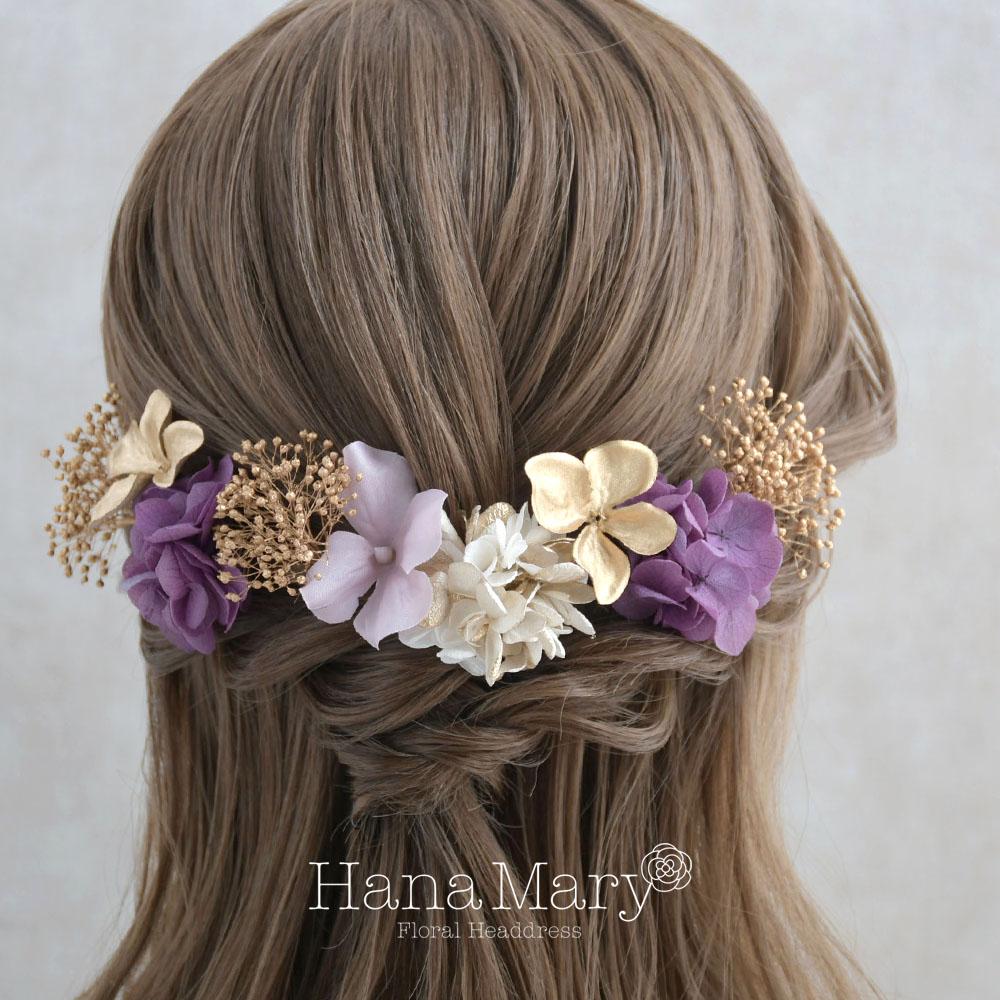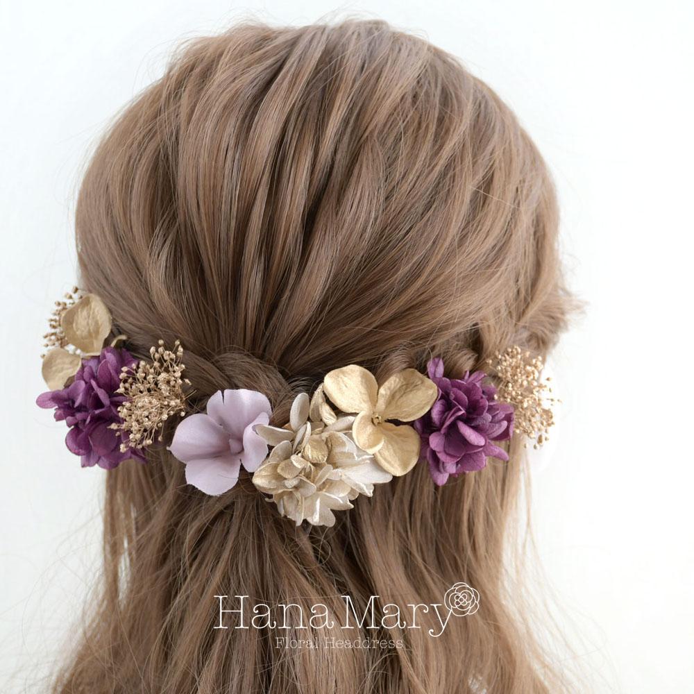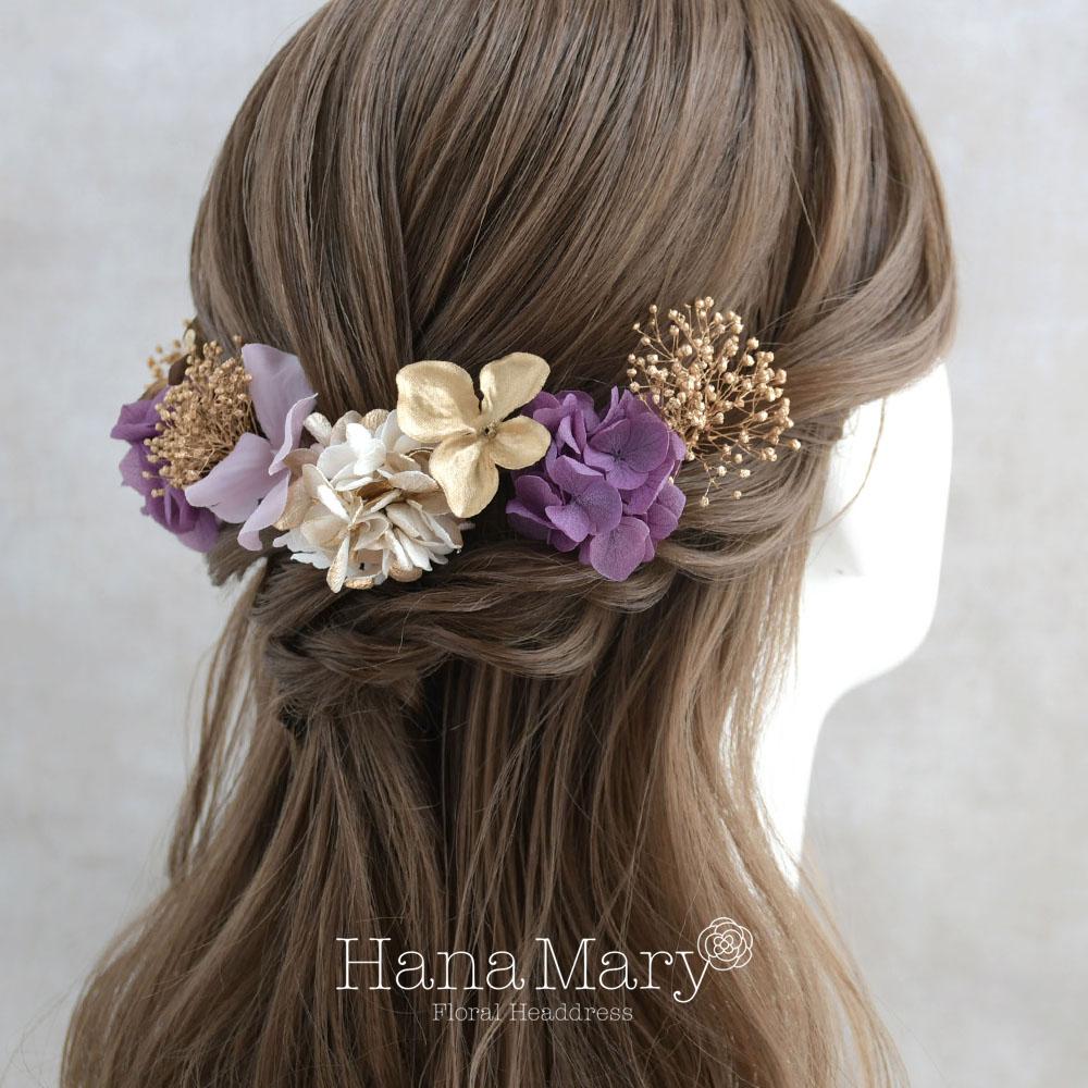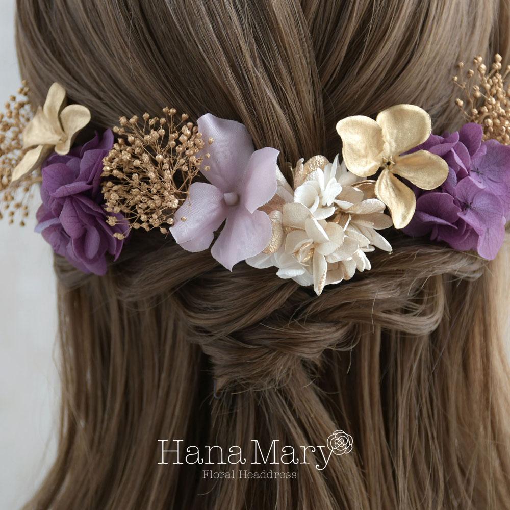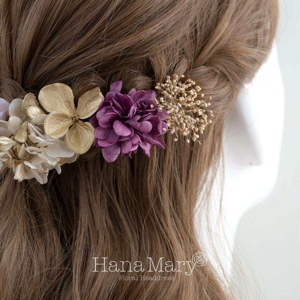 一輪の紫陽花と小花で綴る【ゴールド 紫】卒業式 成人式 結婚式 振袖 袴 髪飾り 着物