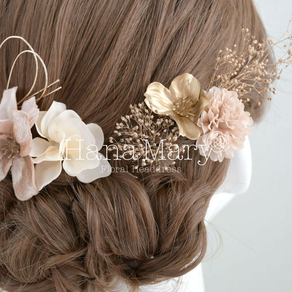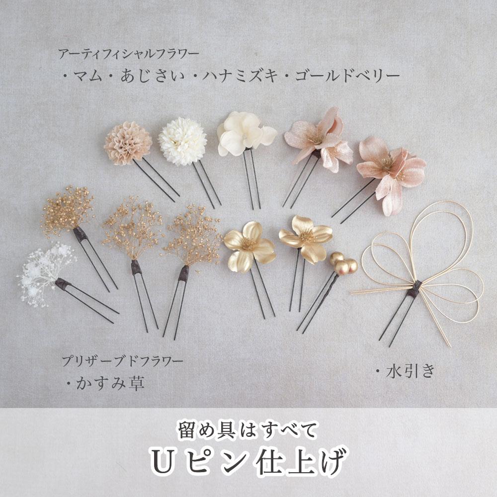 その日のヘアスタイルによって自由に一輪一輪配置できます。お花の数が多い場合でも、アメピンを追加して簡単にしっかりと固定できます。