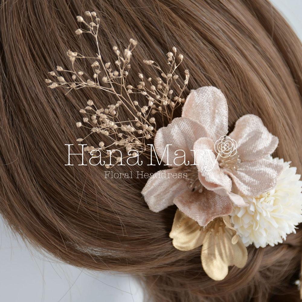高級感のあるベロア生地のハナミズキのお花をメインに、マムやアジサイ、かすみ草などでアレンジした髪飾りです。