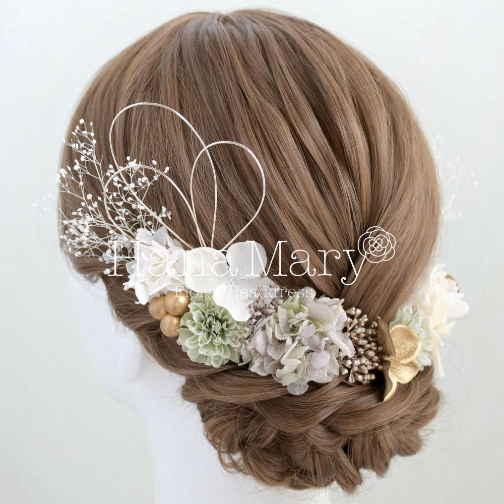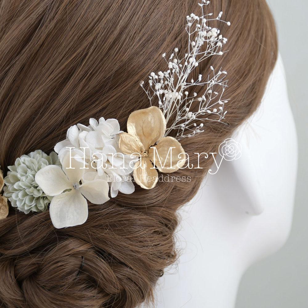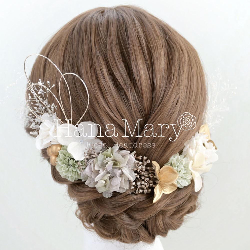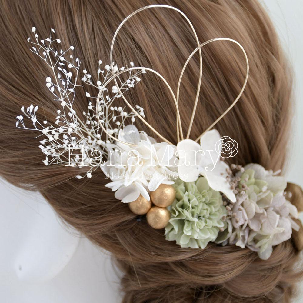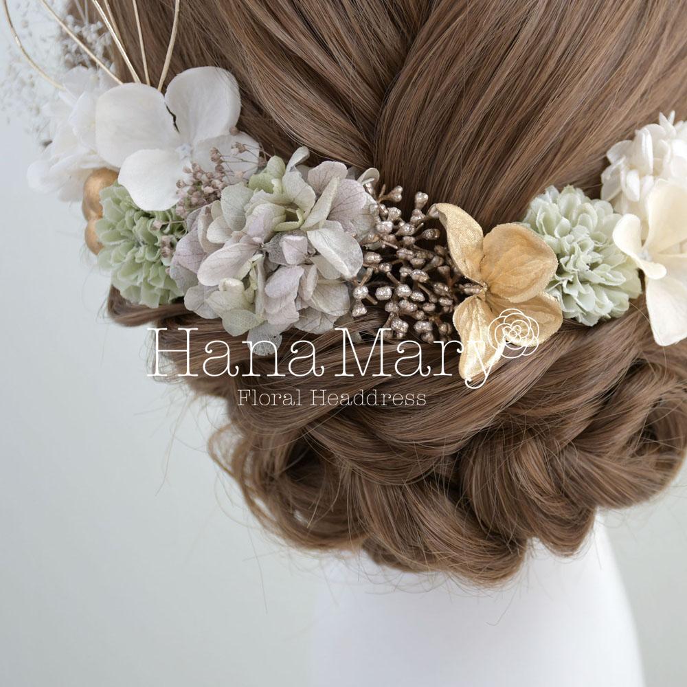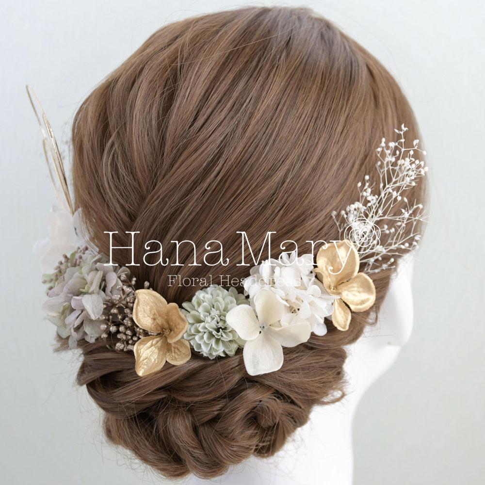 プリザーブドフラワーの紫陽花をメインにかすみ草や小花でアレンジされたお祝いヘアブーケ。