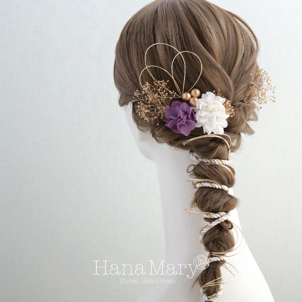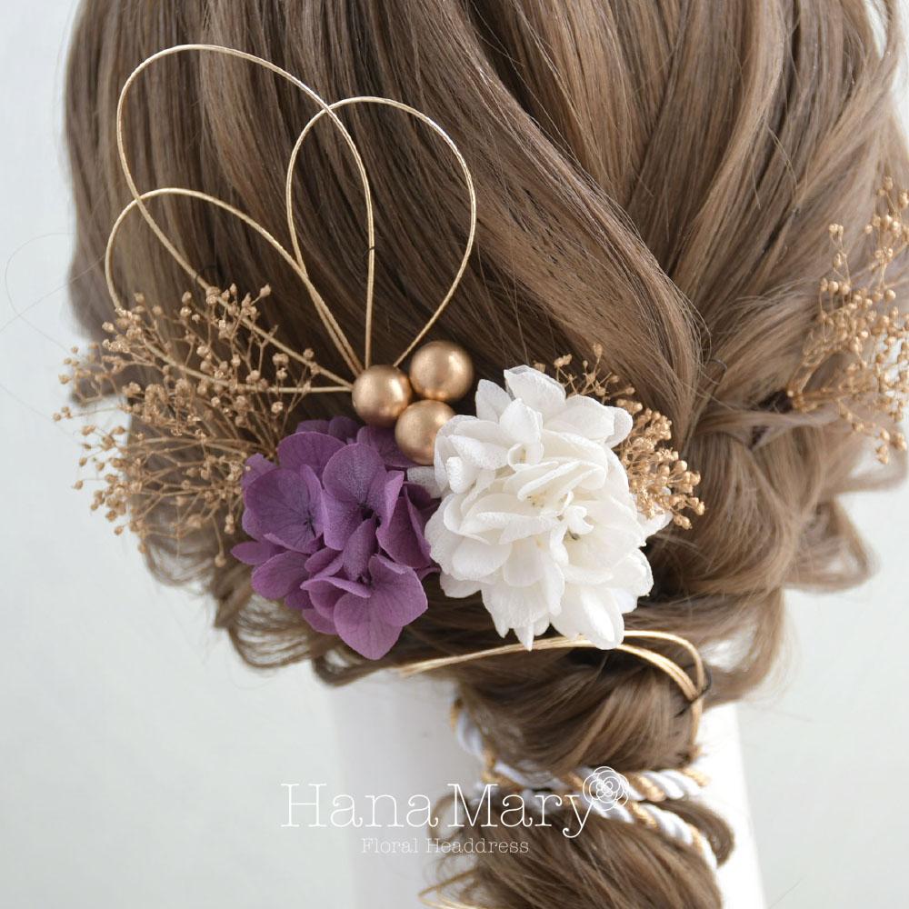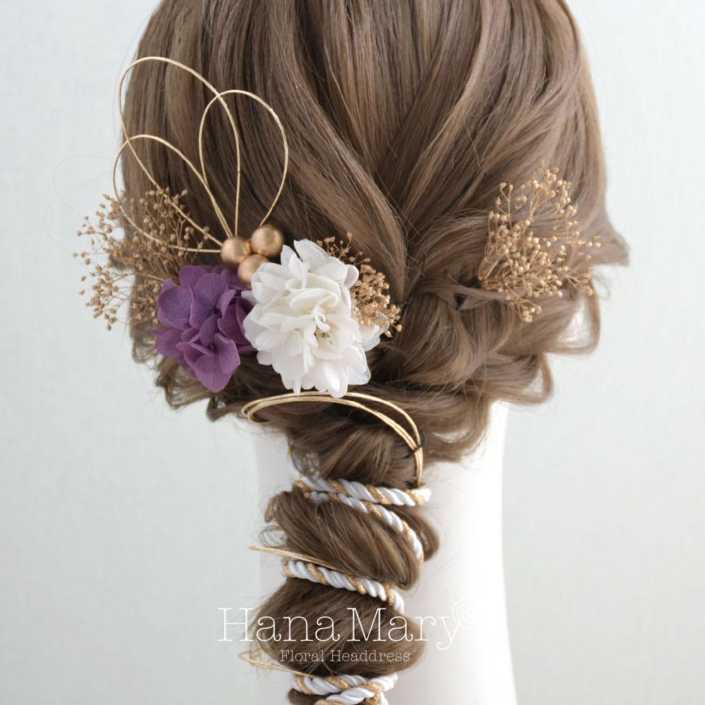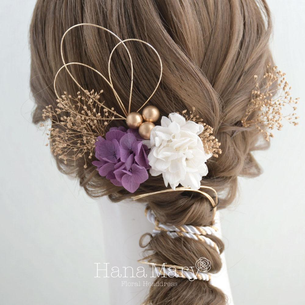 髪飾り 卒業式 成人式 振袖 袴 着物 水引き アレンジ【紫 白 ゴールド】結婚式