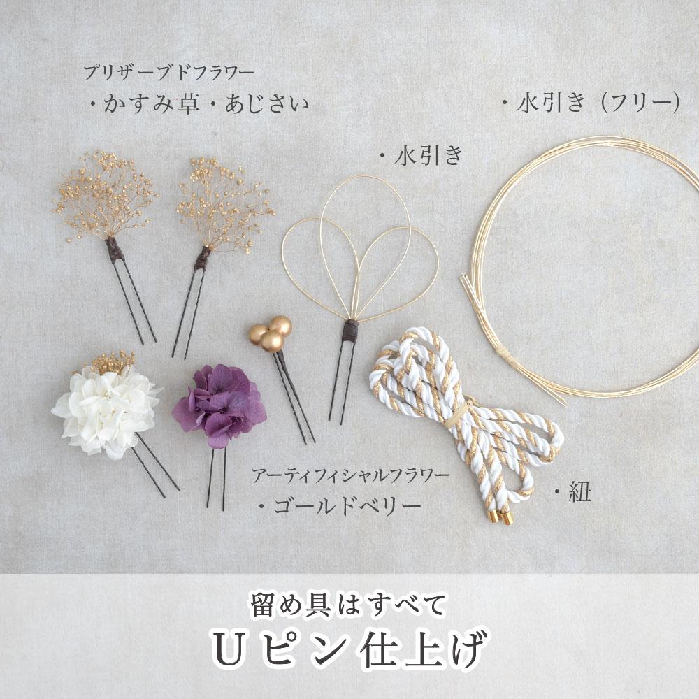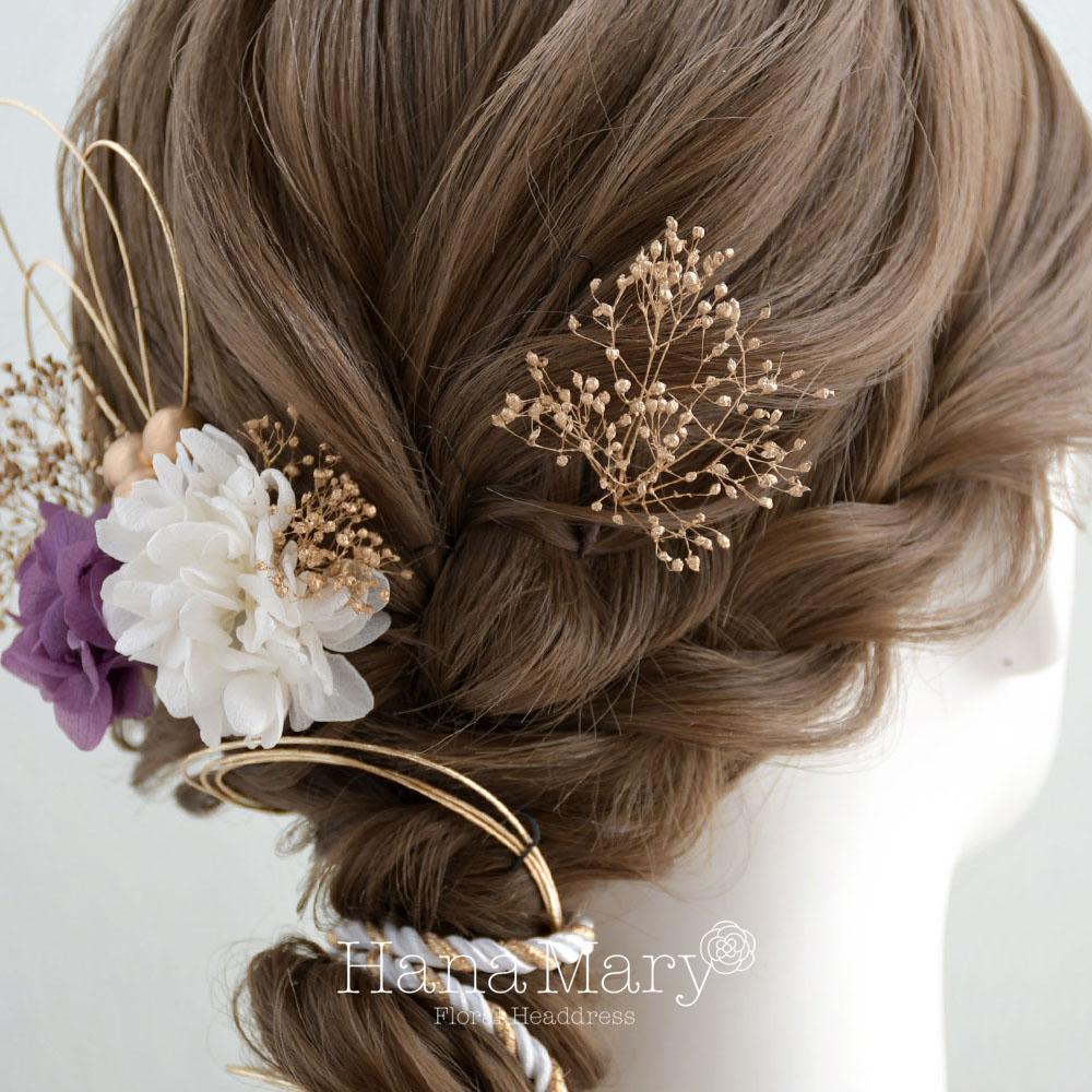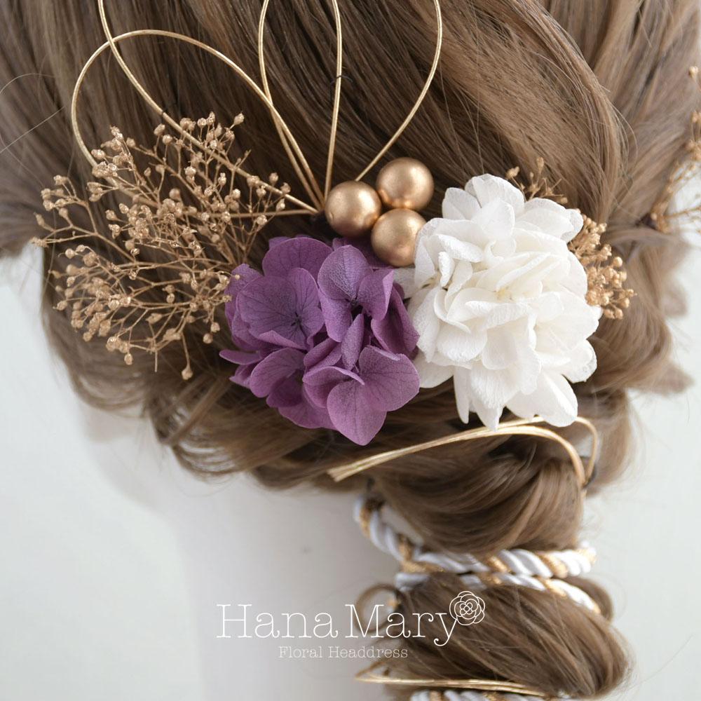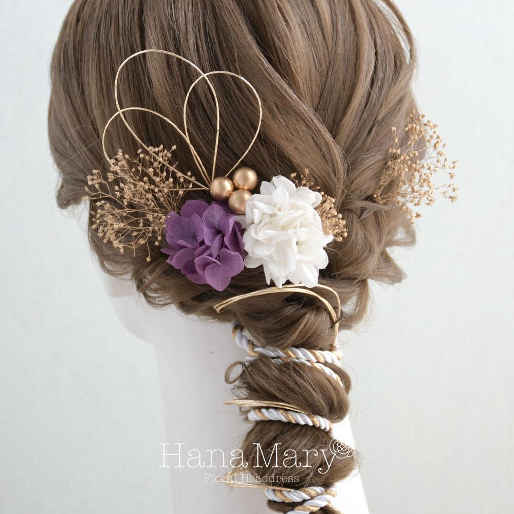 髪飾り 卒業式 成人式 振袖 袴 着物 水引き アレンジ【紫 白 ゴールド】結婚式