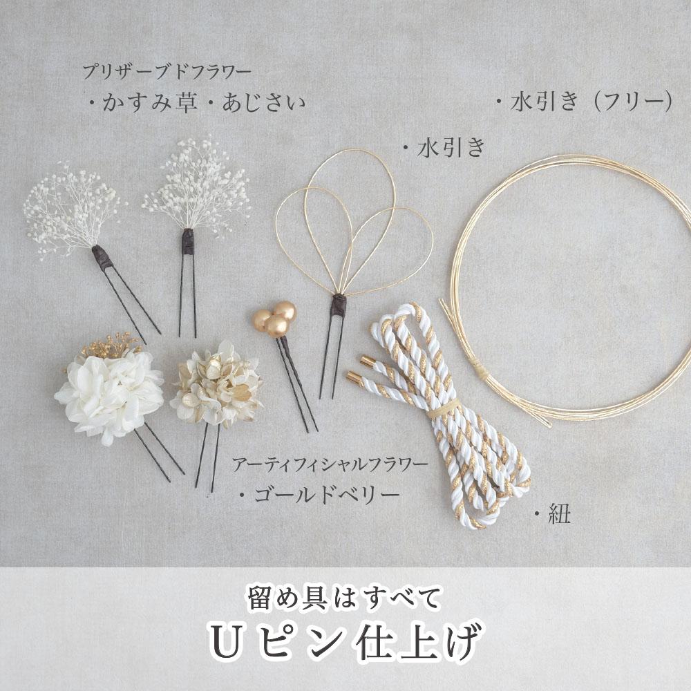 ドライフラワーのアジサイとかすみ草を組み合わせたシンプルで使いやすい髪飾り。完成品の水引きと自由にアレンジが出来るフリーなタイプの水引き、紐がセットになりました。