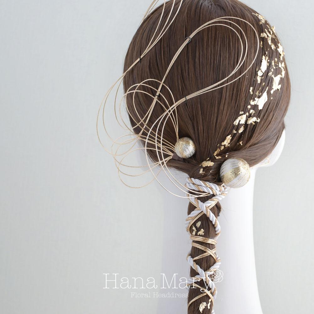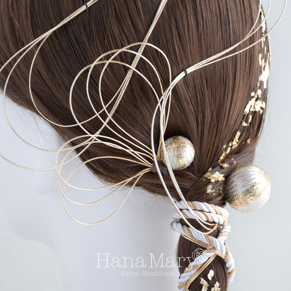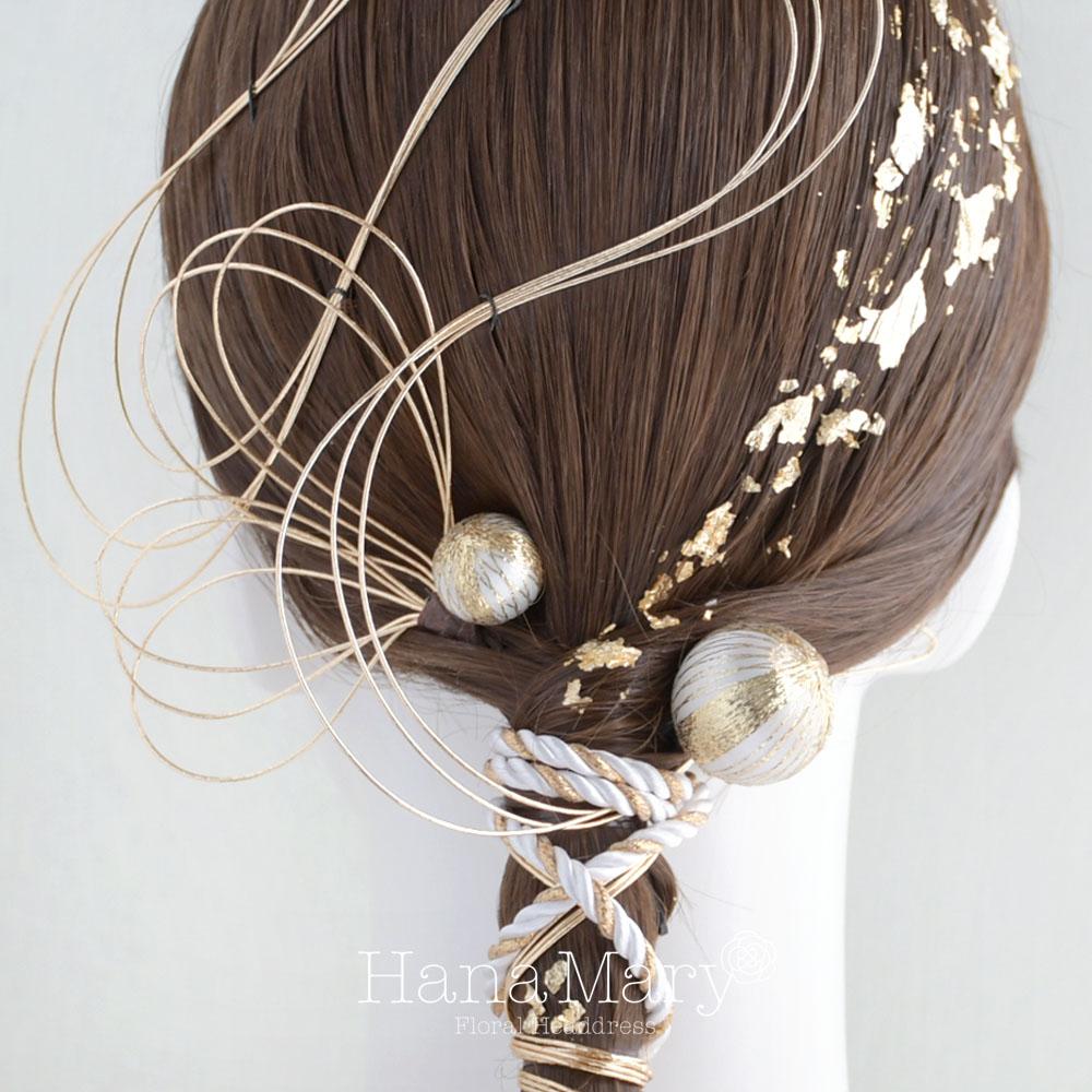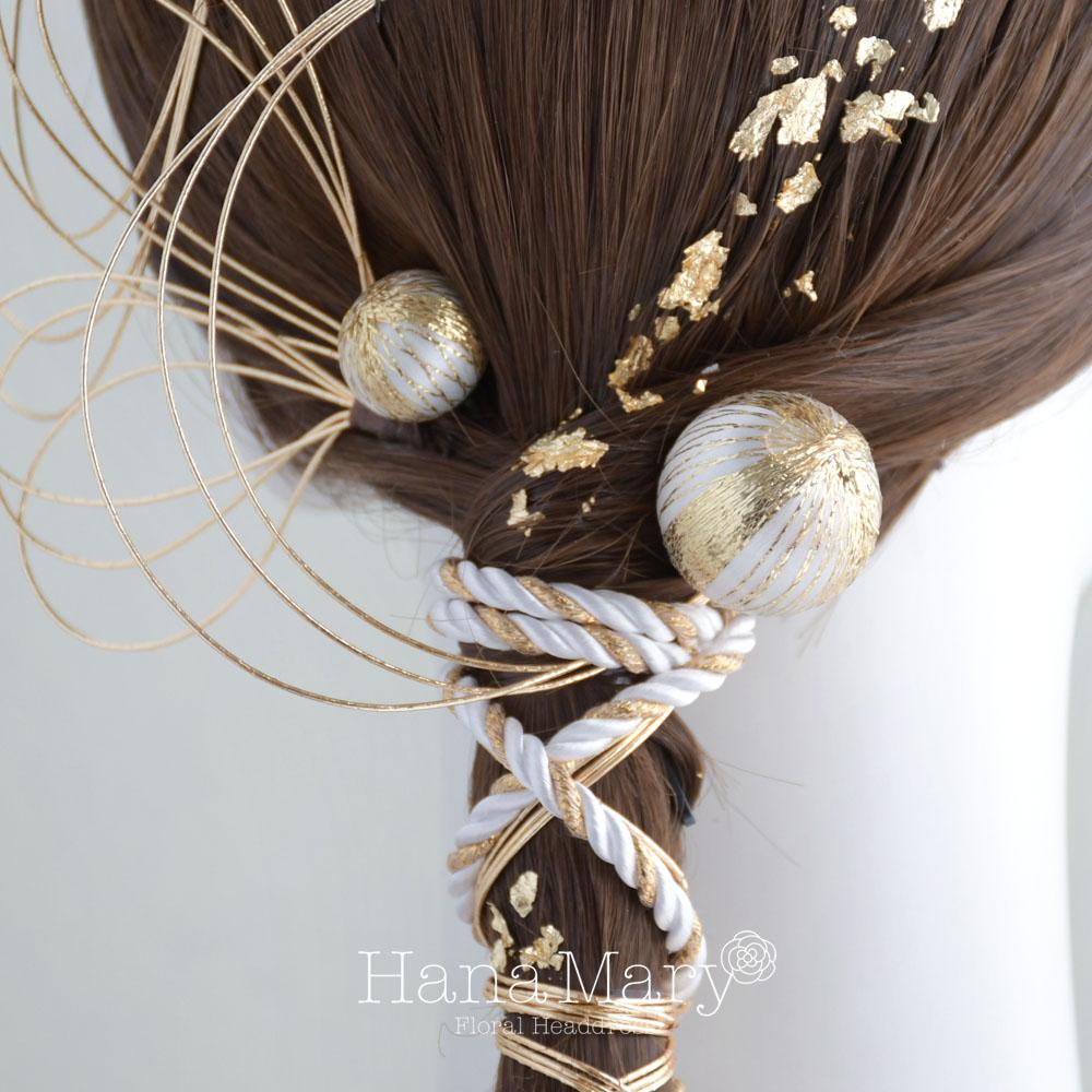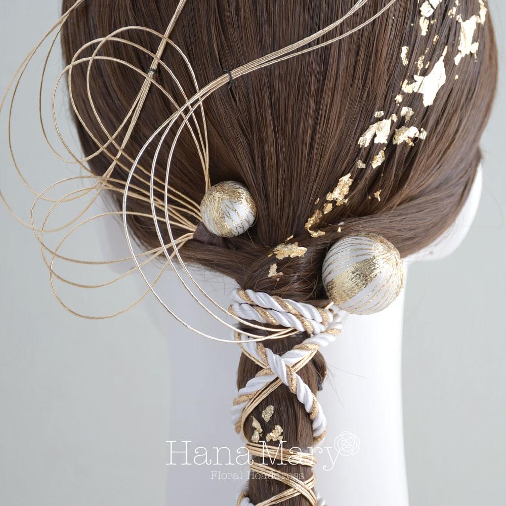 髪飾り 卒業式 成人式 振袖 袴 水引き アレンジ 和玉 鞠玉 結婚式【白 ゴールド】