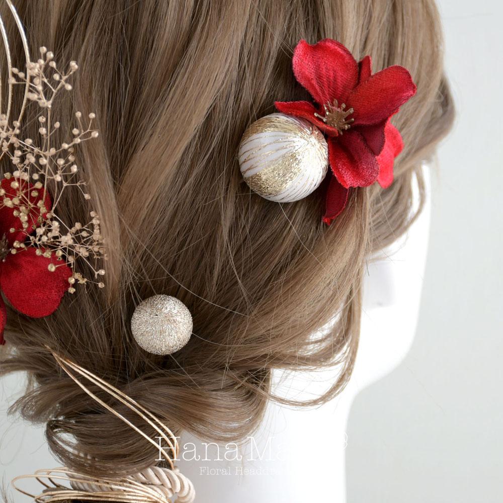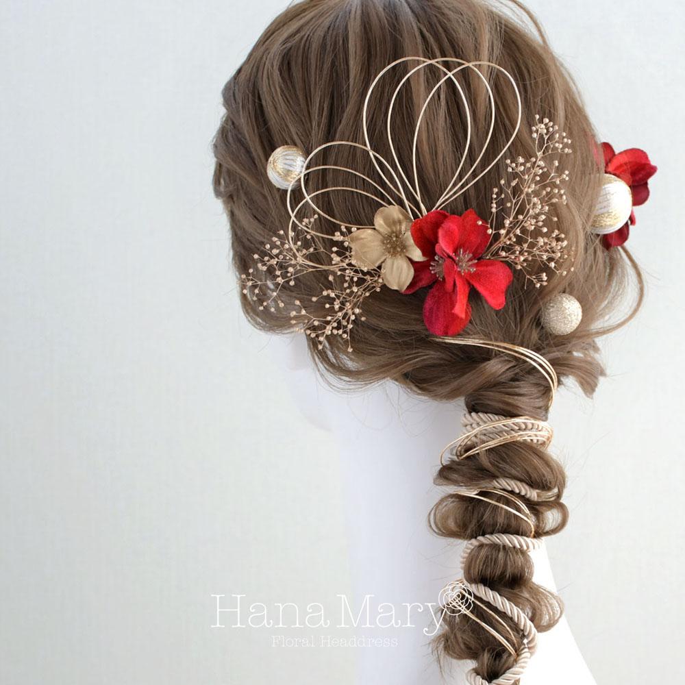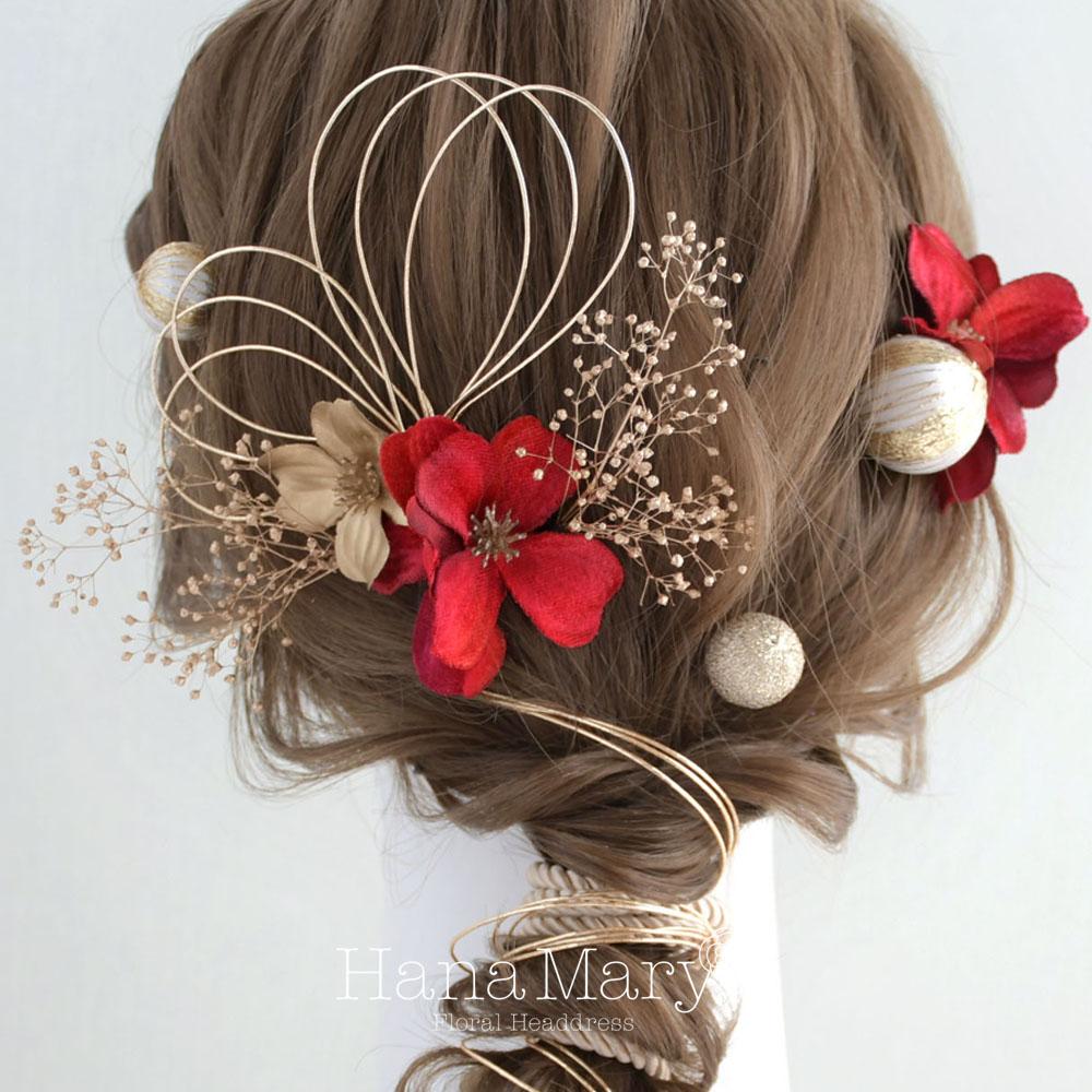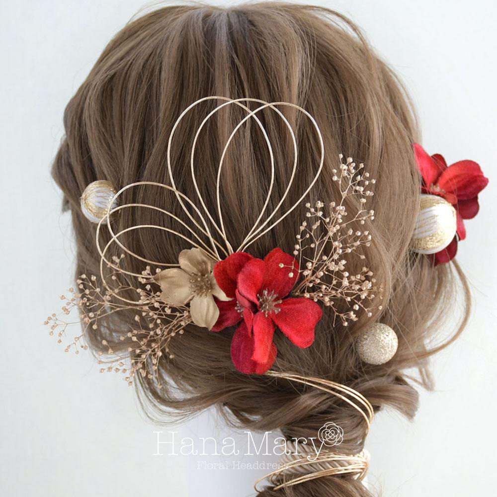 髪飾り 成人式 卒業式 水引き 和玉 鞠玉 【ハナミズキとかすみ草】モダンレッド