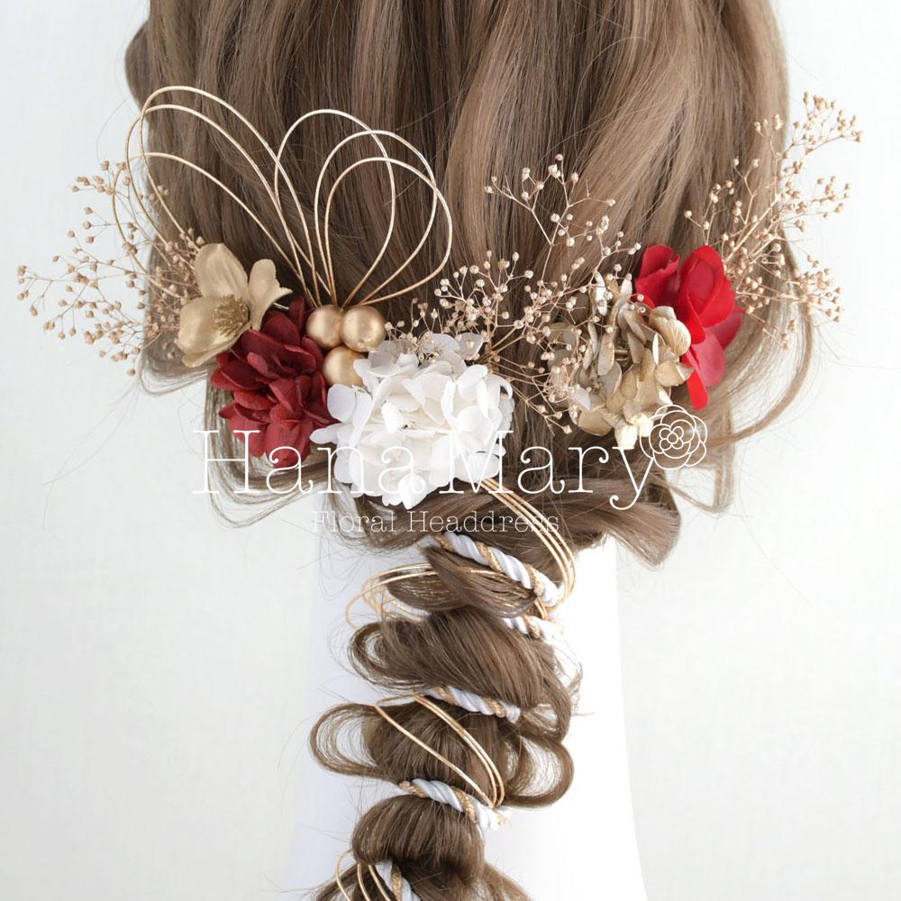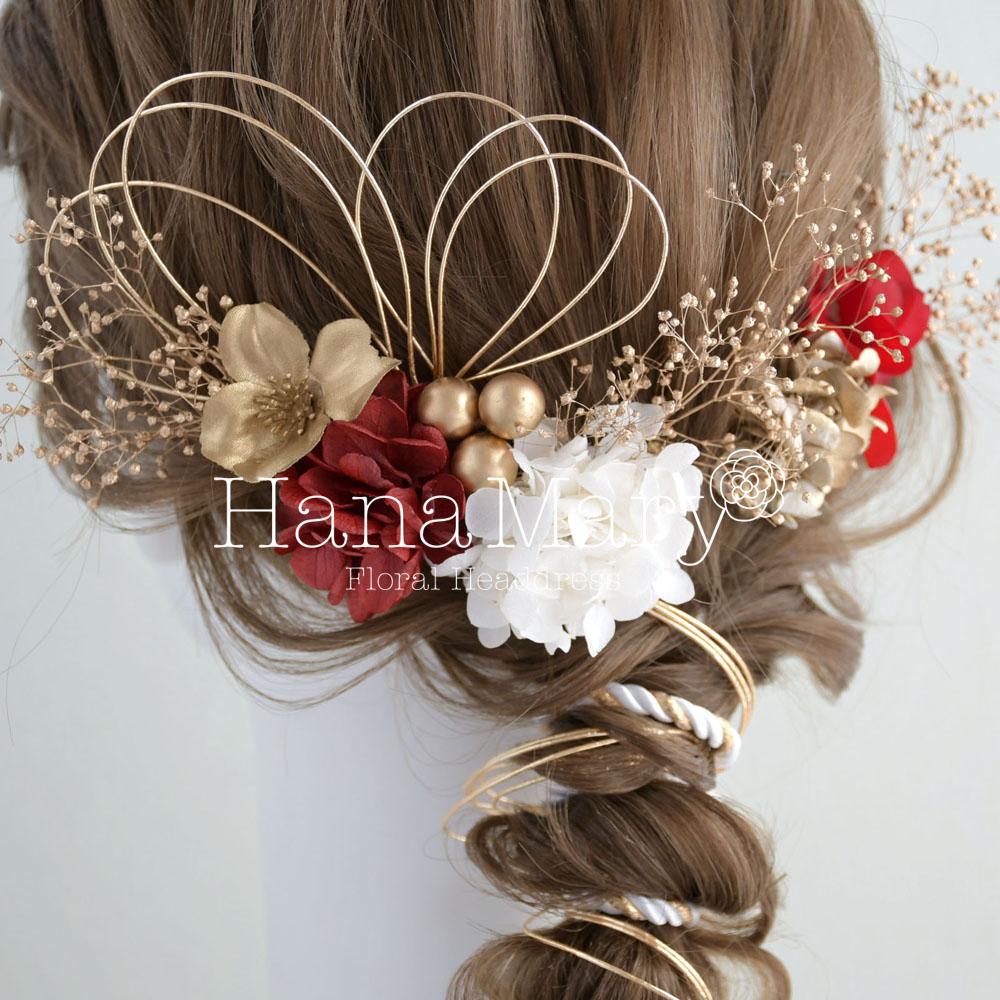 髪飾り 成人式 卒業式 水引き 赤 白 ドライフラワー【ゴールドかすみ草】結婚式 振袖 袴
