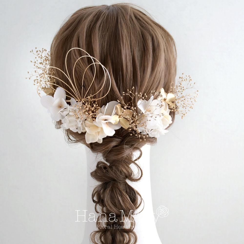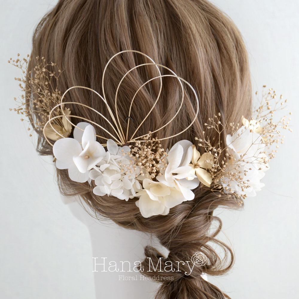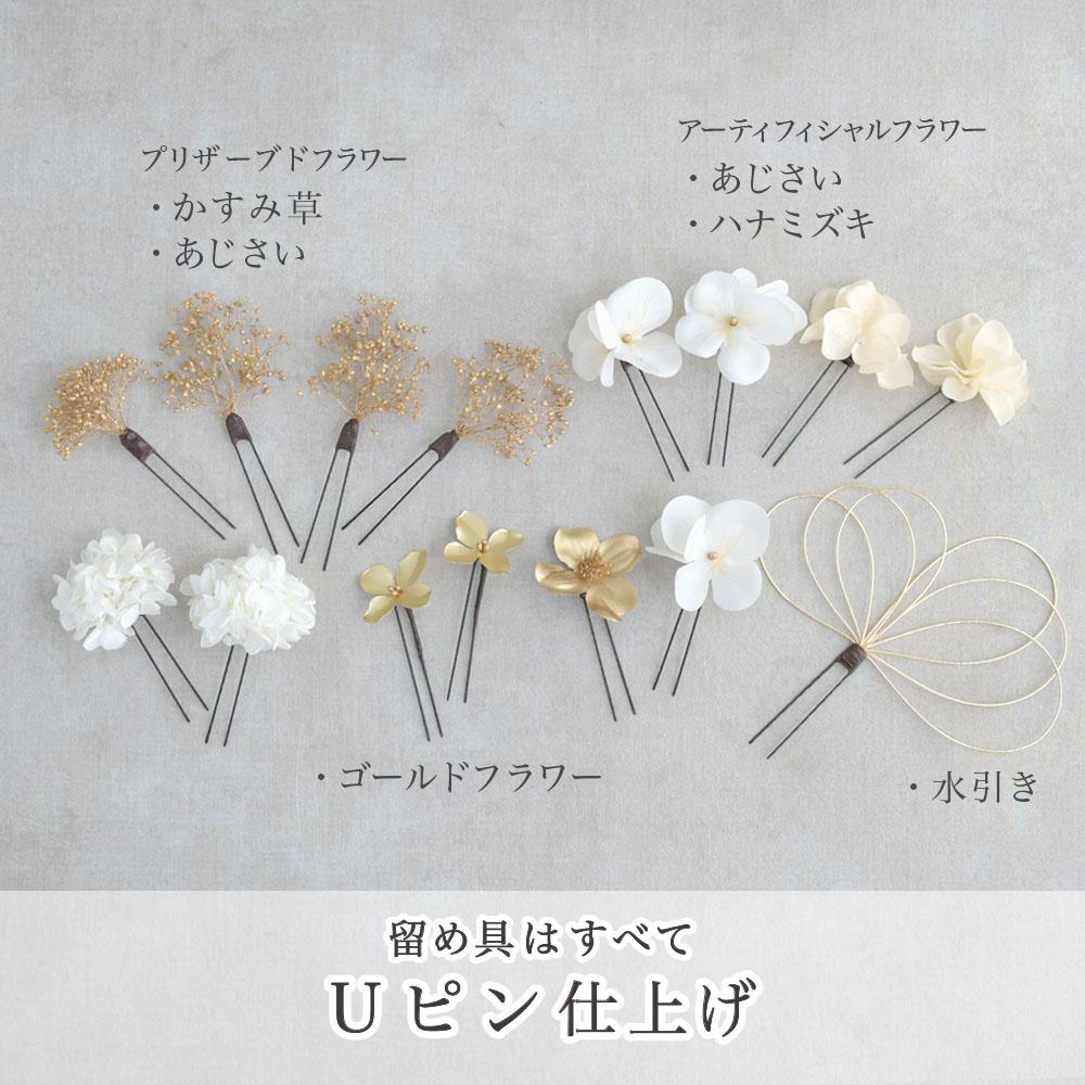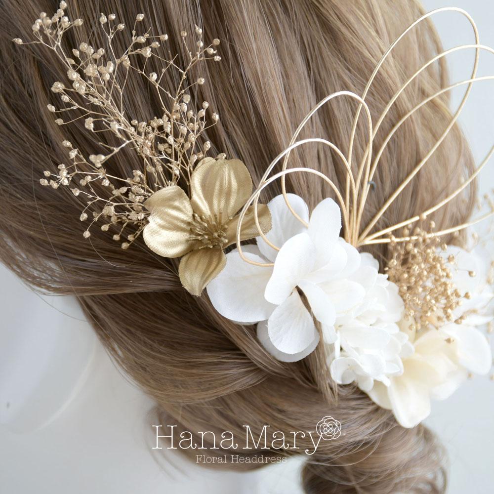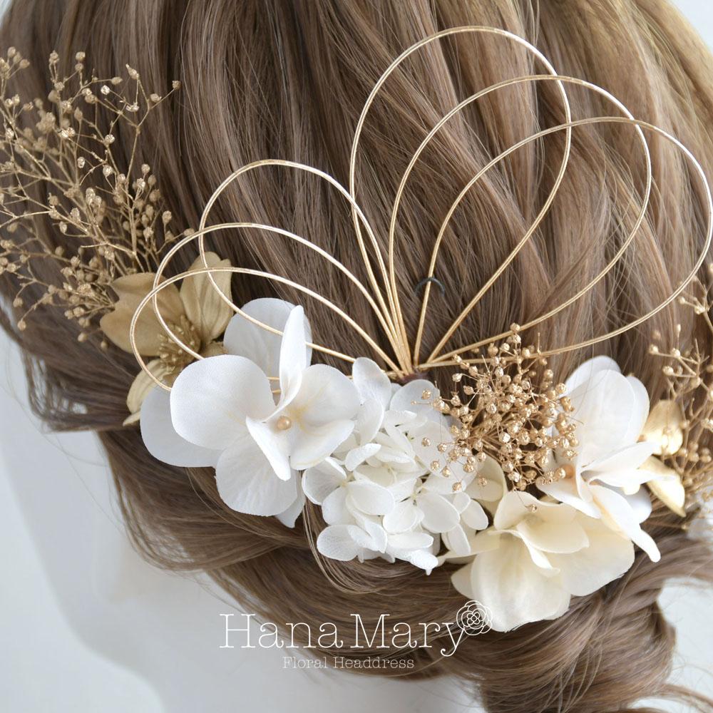 ホワイト、クリーム、ゴールドのカラーでアレンジされ、清楚にそして華やかに和装コーデを飾ります。