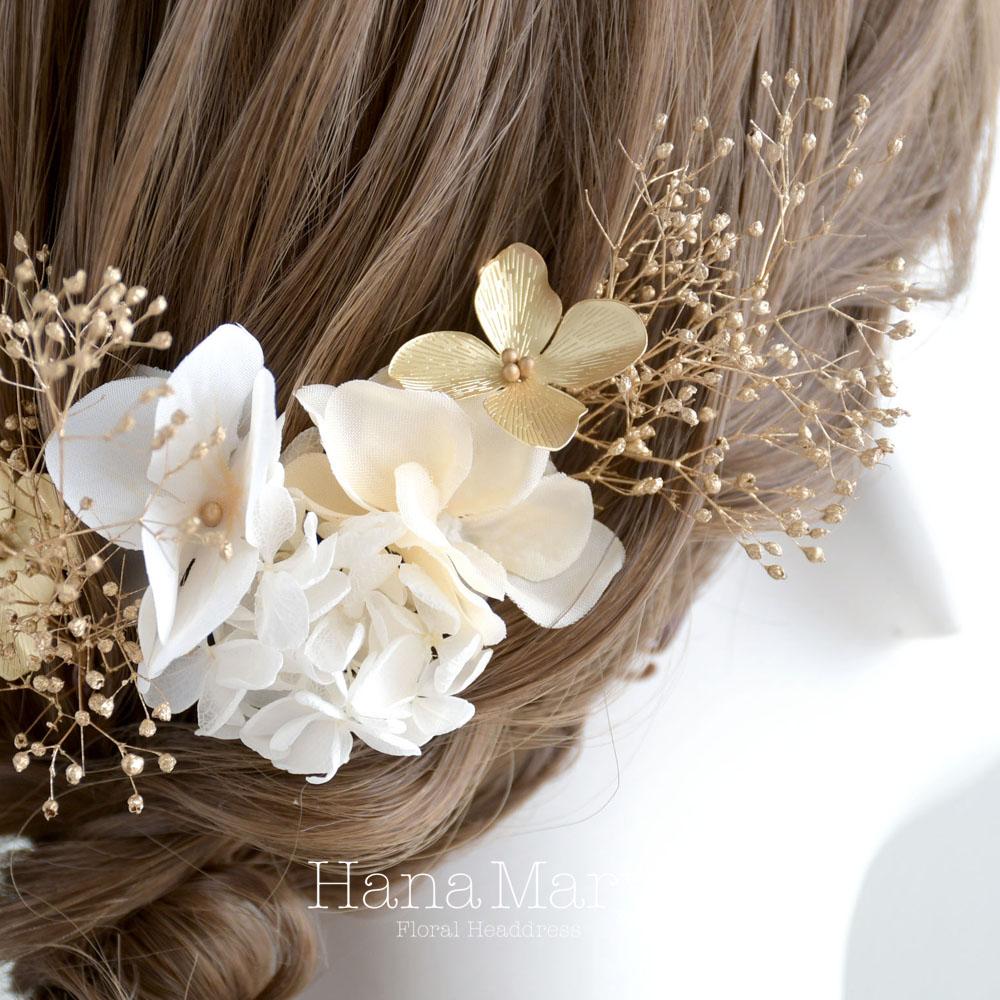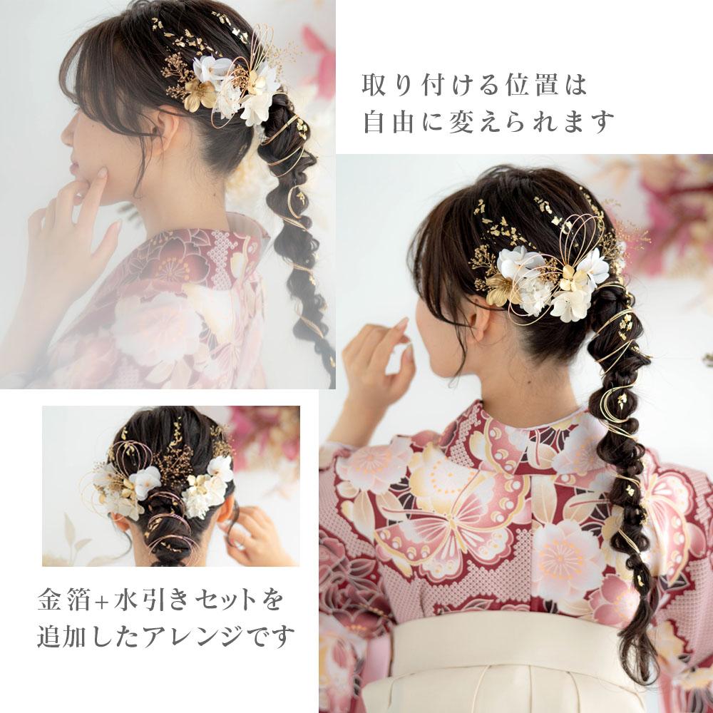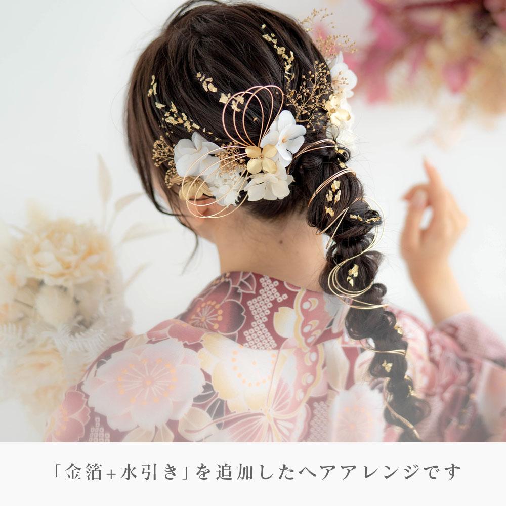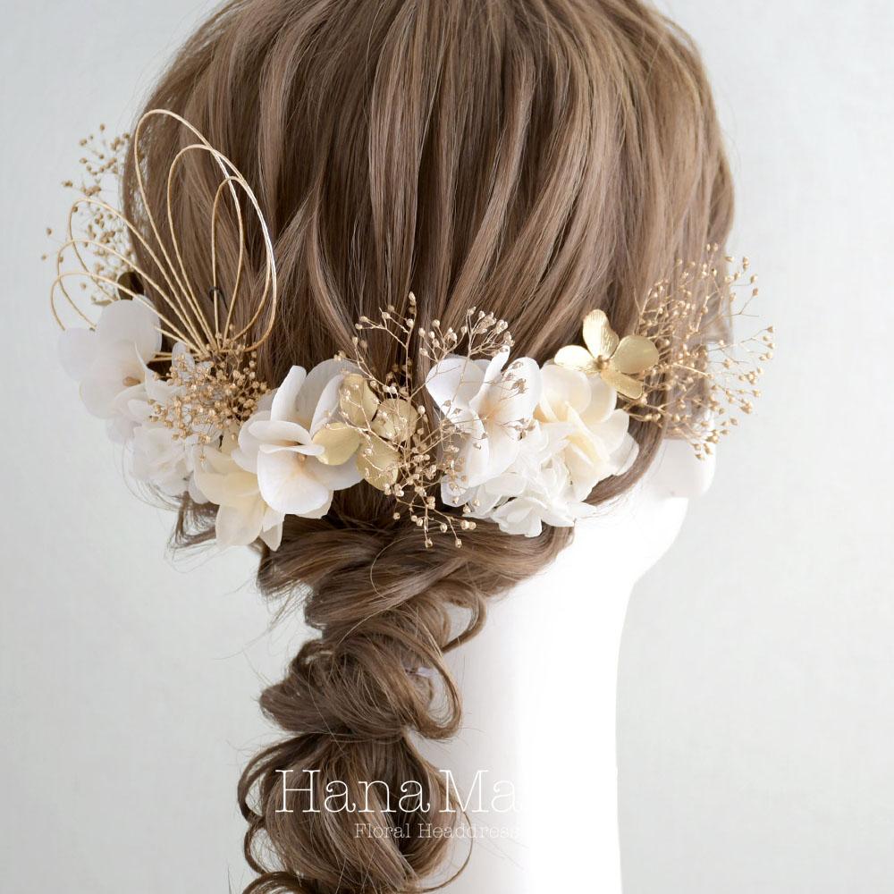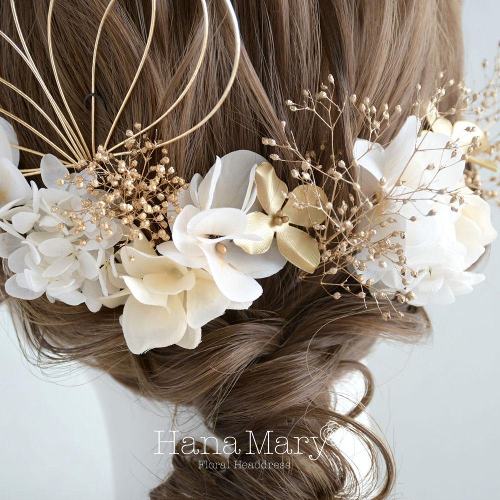 ホワイト、クリーム、ゴールドのカラーでアレンジされ、清楚にそして華やかに和装コーデを飾ります。