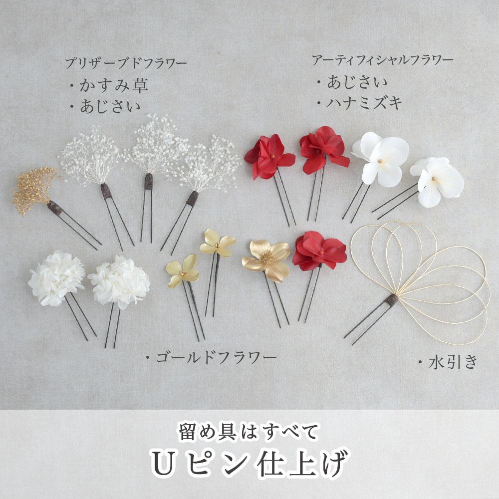 その日のヘアスタイルによって自由に一輪一輪配置できます。お花の数が多い場合でも、アメピンを追加して簡単にしっかりと固定できます。