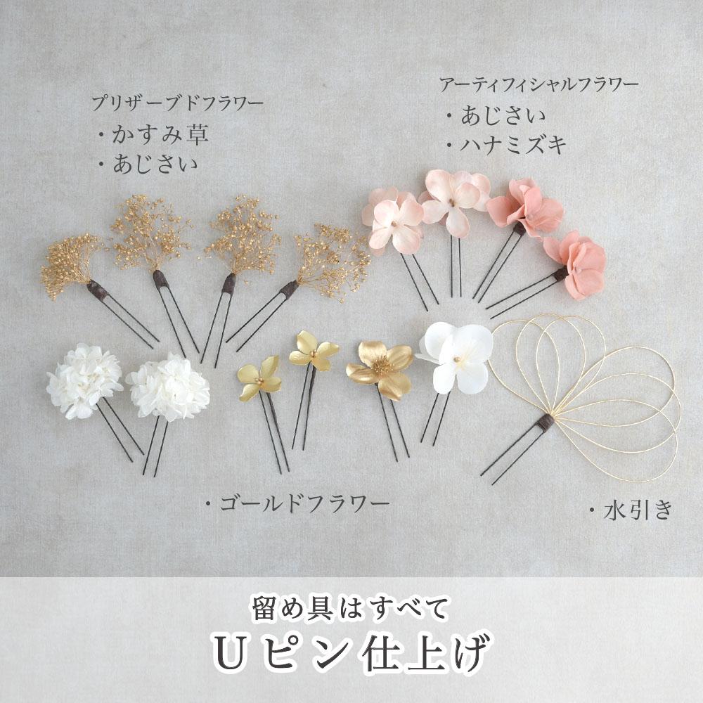 その日のヘアスタイルによって自由に一輪一輪配置できます。お花の数が多い場合でも、アメピンを追加して簡単にしっかりと固定できます。
