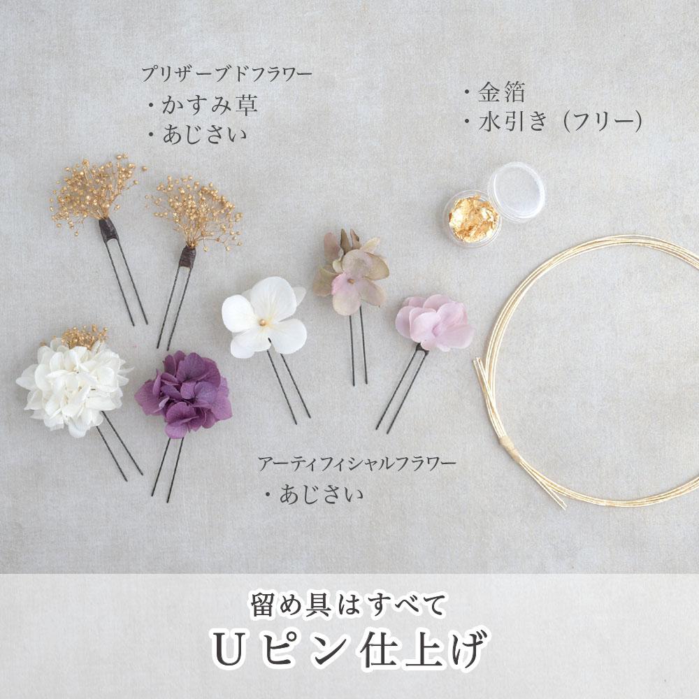 その日のヘアスタイルによって自由に一輪一輪配置できます。お花の数が多い場合でも、アメピンを追加して簡単にしっかりと固定できます。