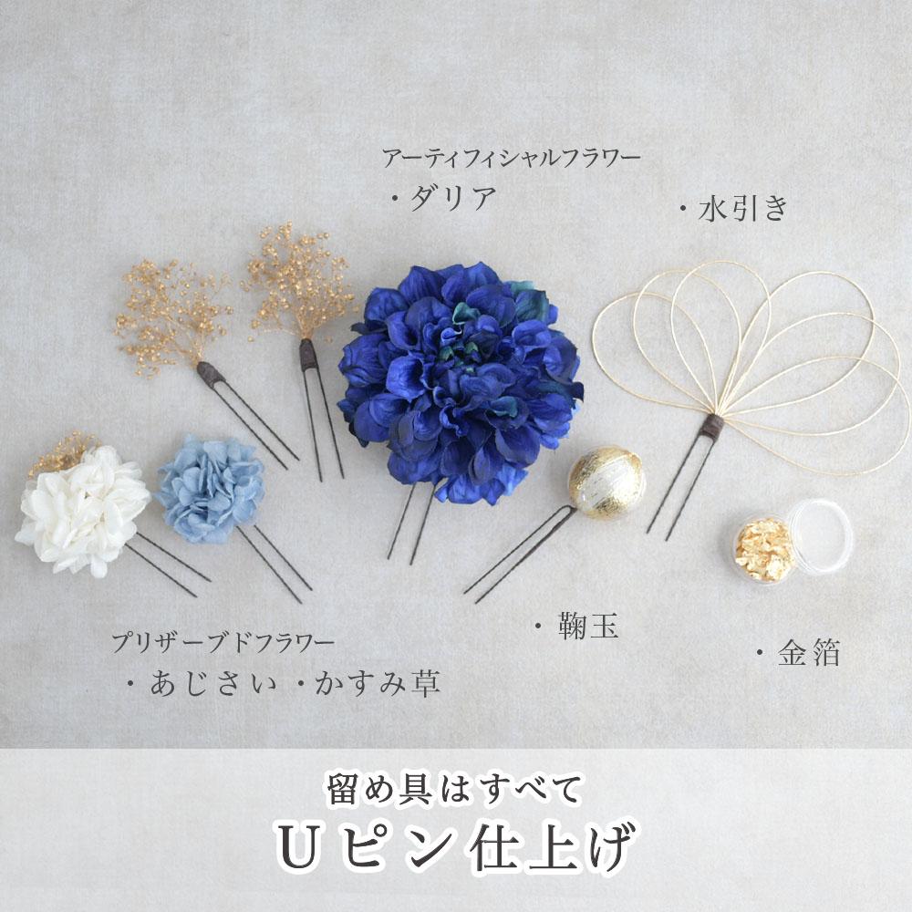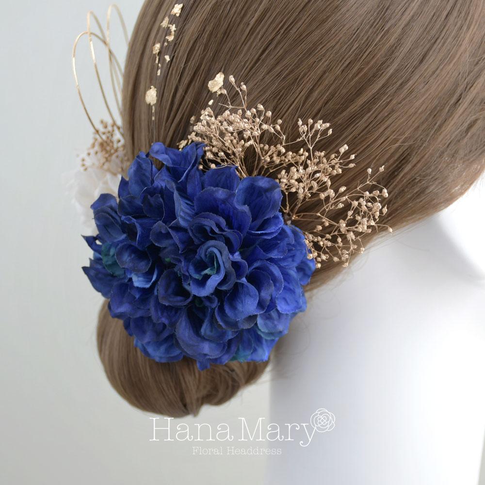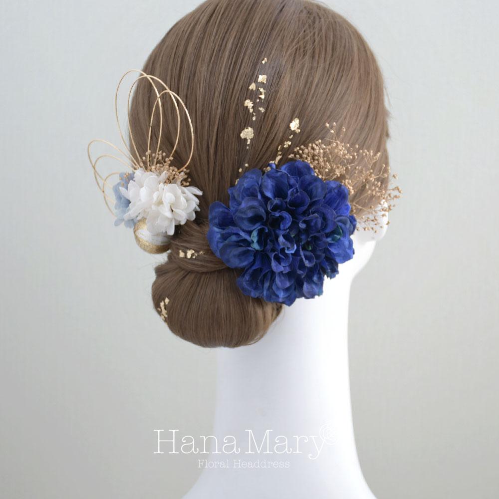 ダリアと青いあじさい 髪飾り 成人式 卒業式 振袖 袴 着物【青 ブルー】水引き 和装