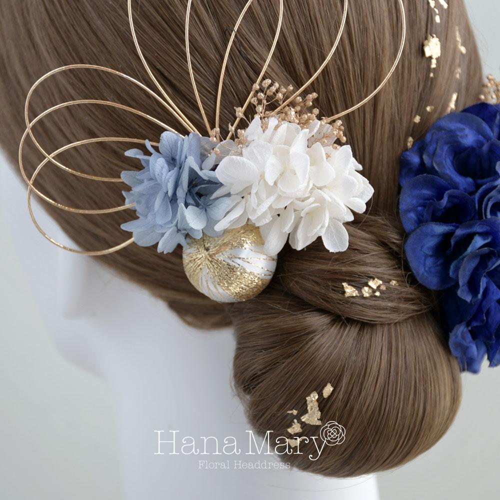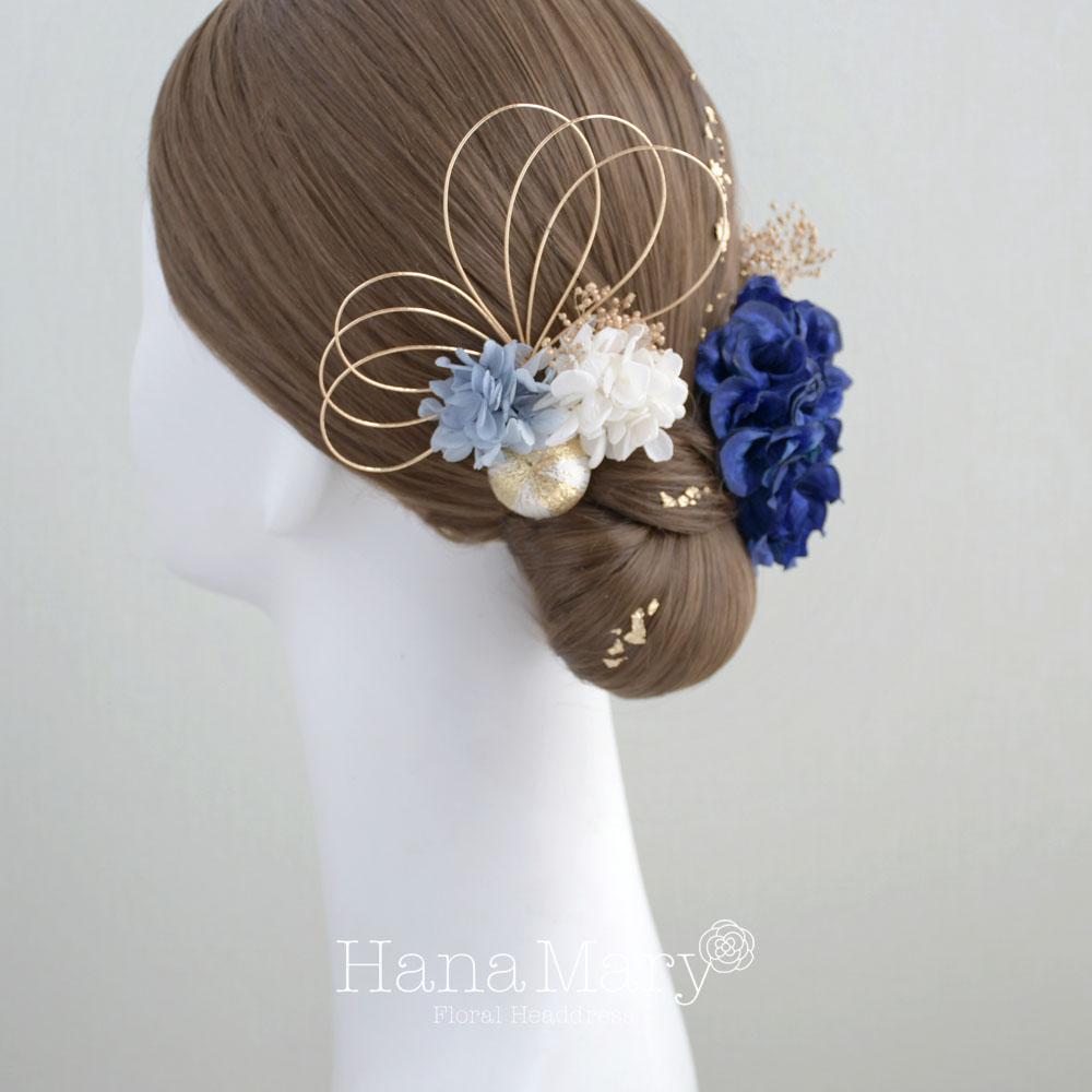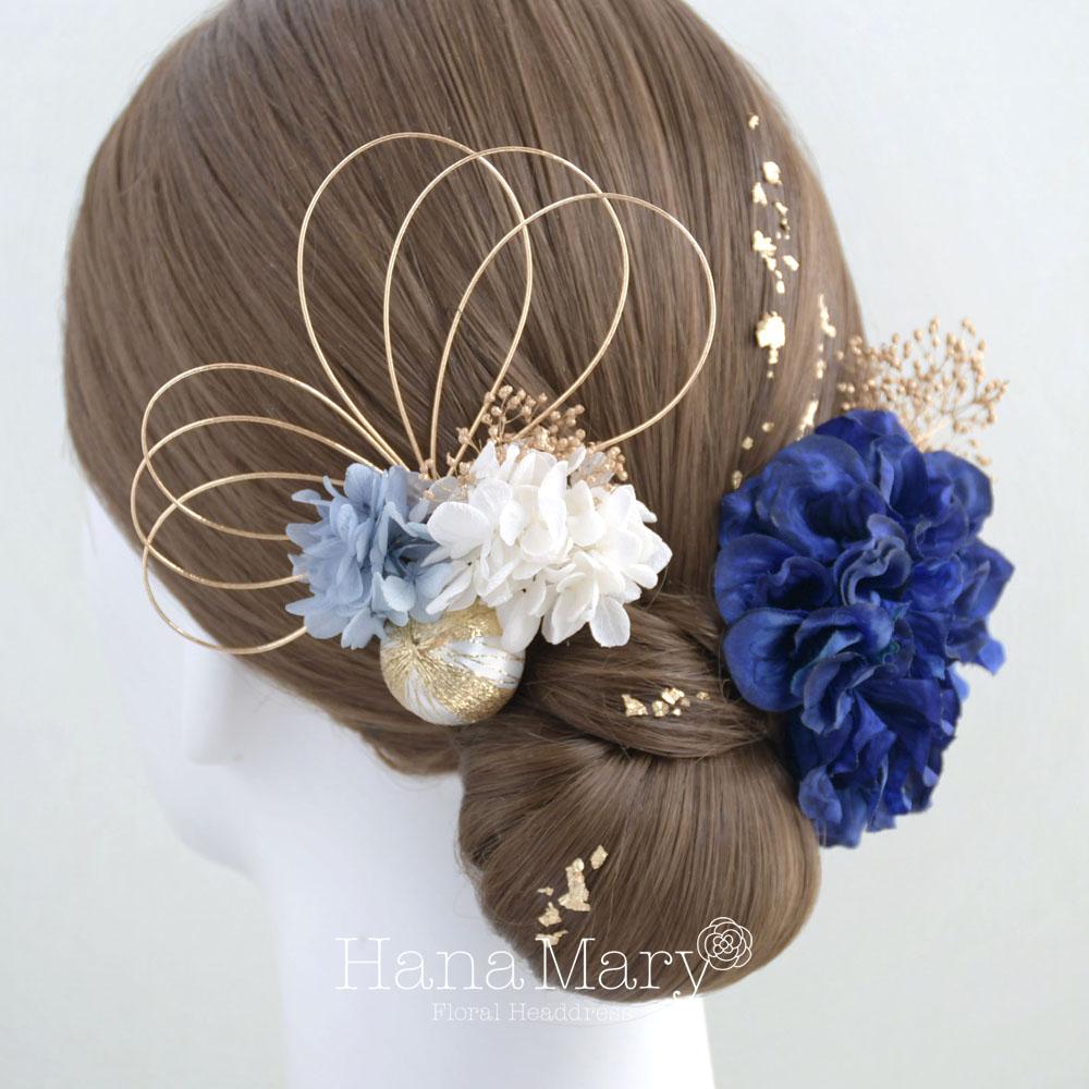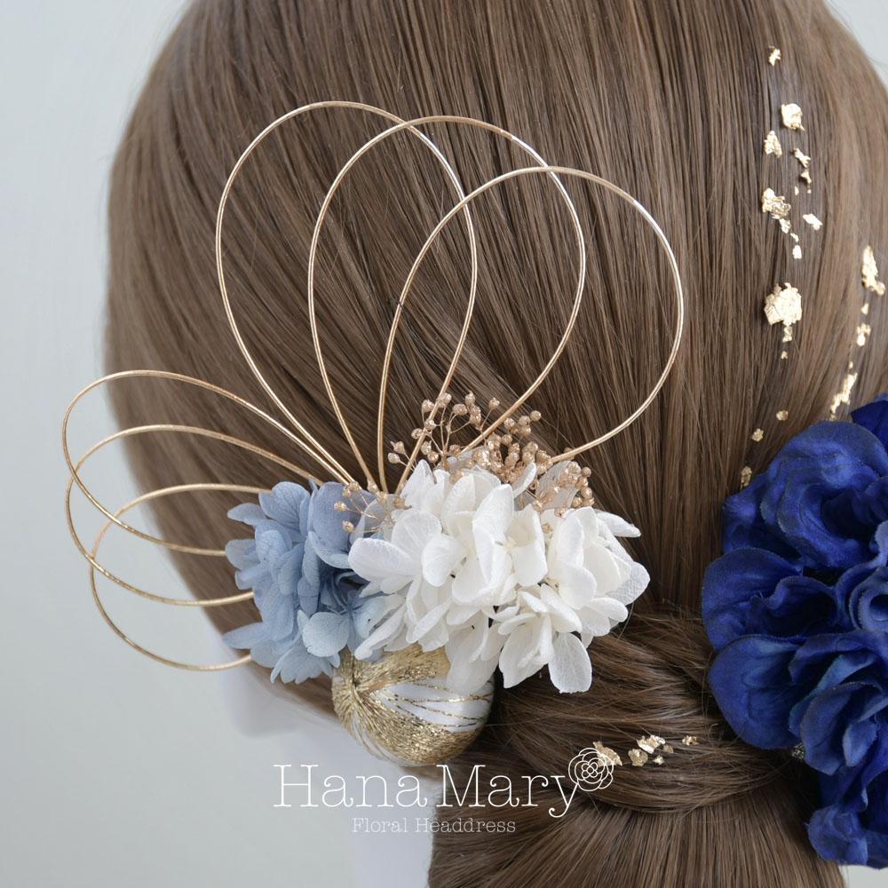 ダリアと青いあじさい 髪飾り 成人式 卒業式 振袖 袴 着物【青 ブルー】水引き 和装