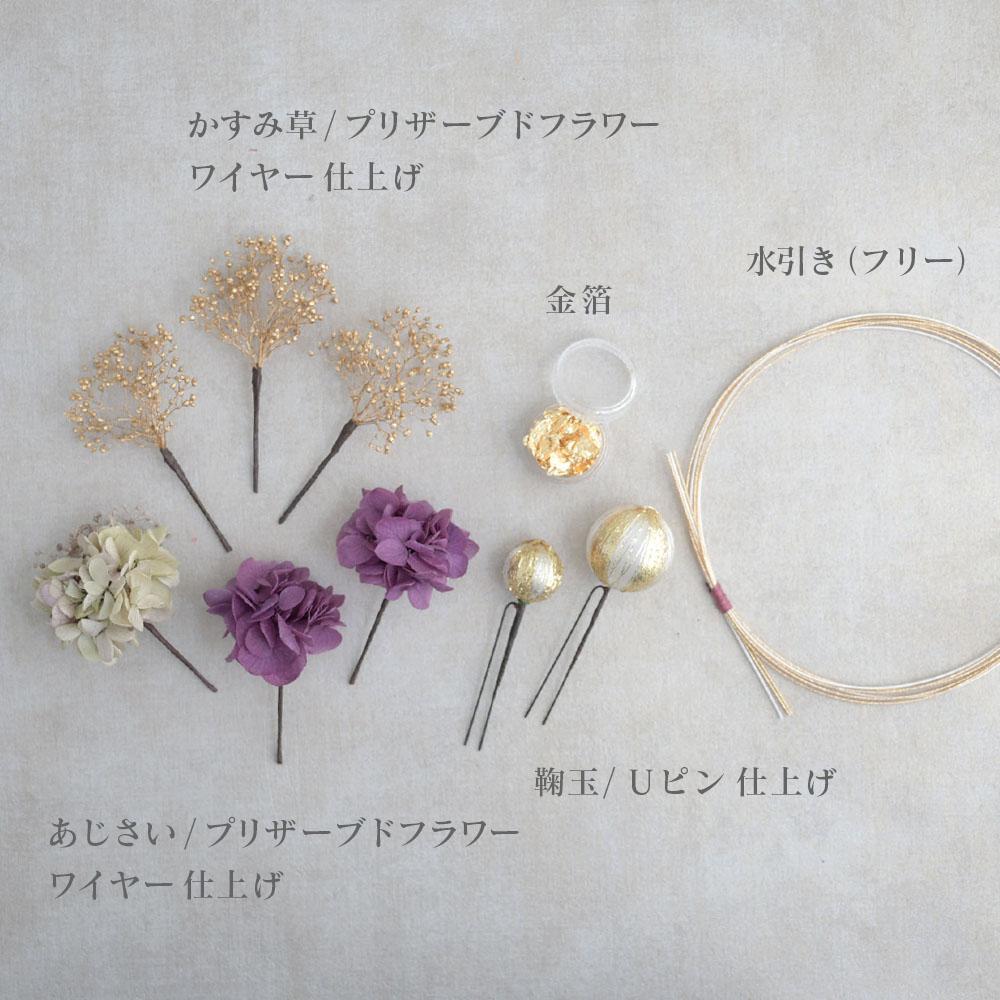 お花はプリザーブドフラワーのあじさい、ゴールドのかすみ草、サイズ違いの鞠玉と水引きに金箔(金箔風に加工)をセットしています。