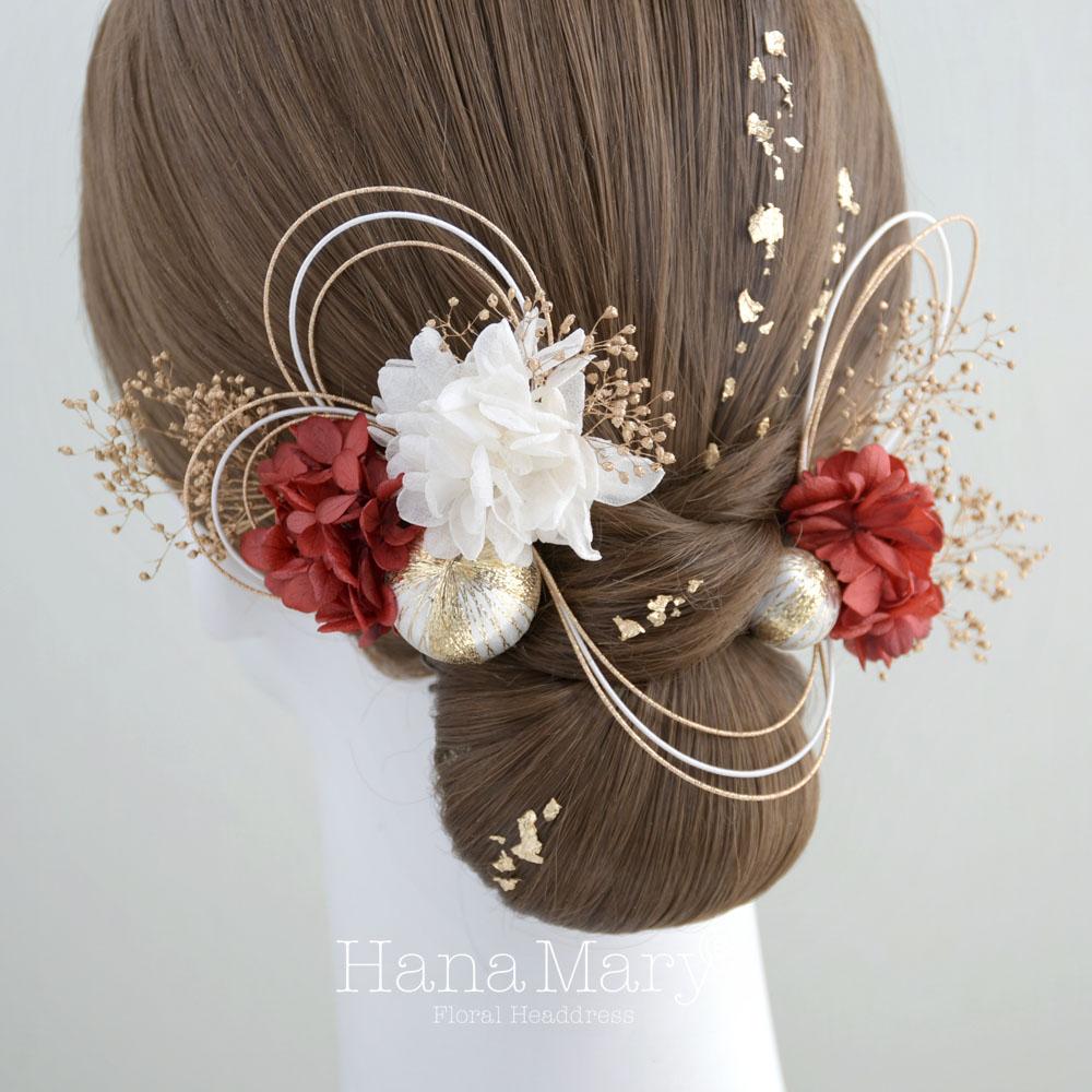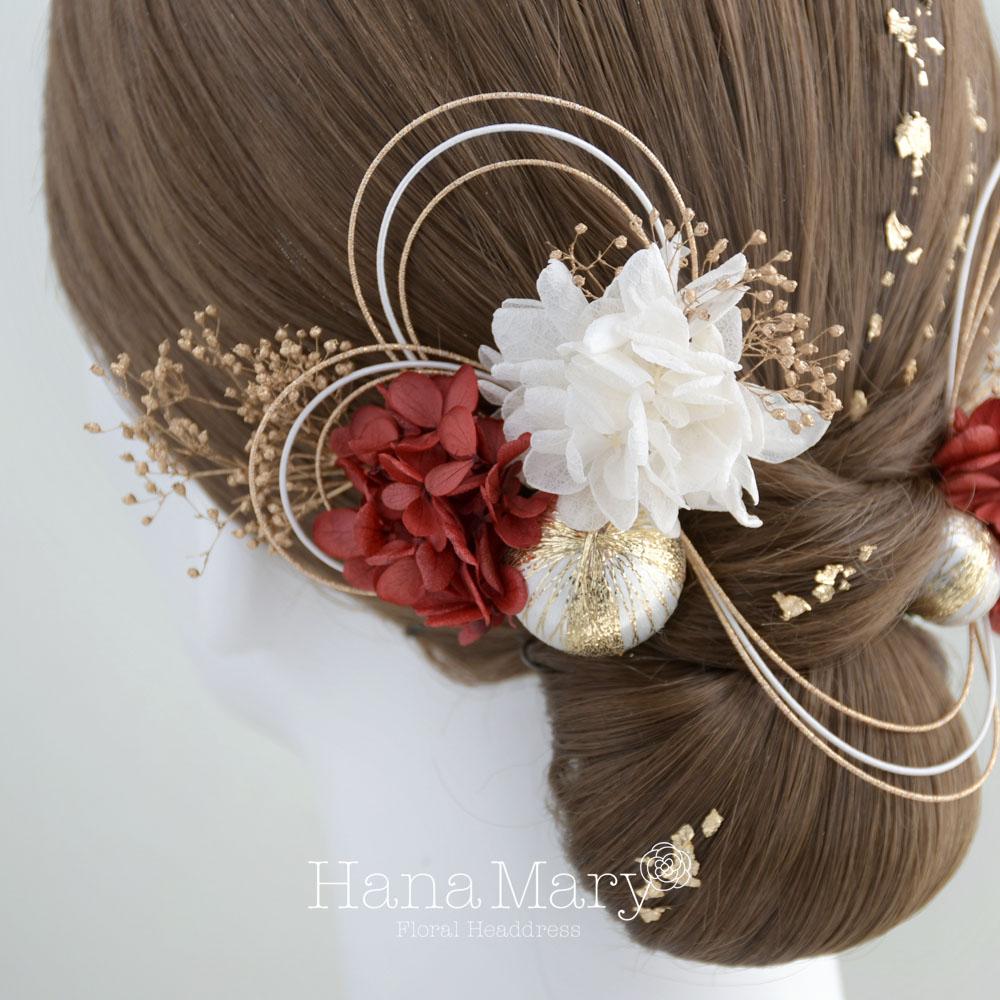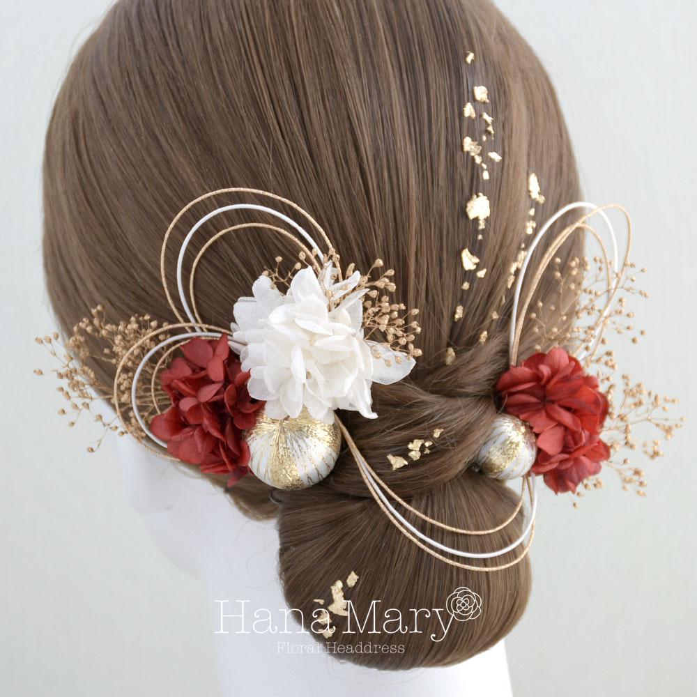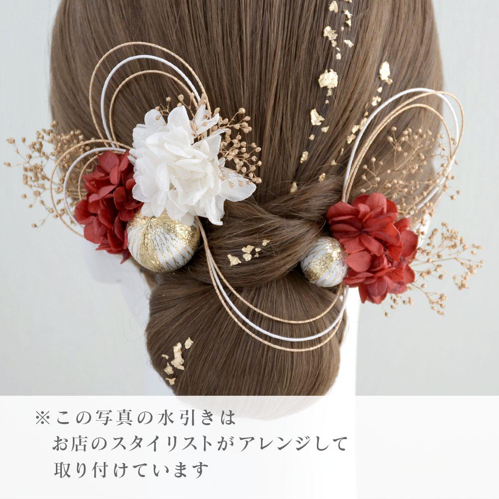 鞠玉とアジサイの髪飾り 卒業式 成人式 振袖 袴 結婚式【赤 白】水引き