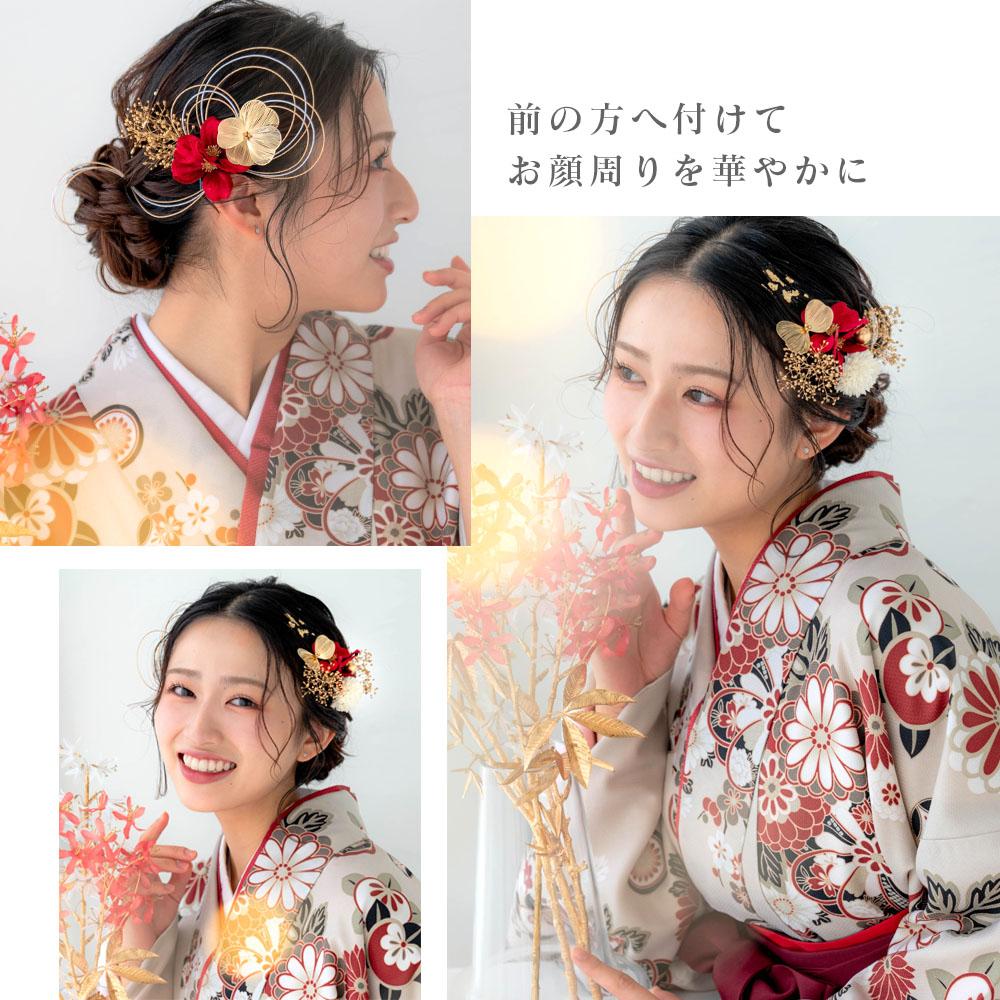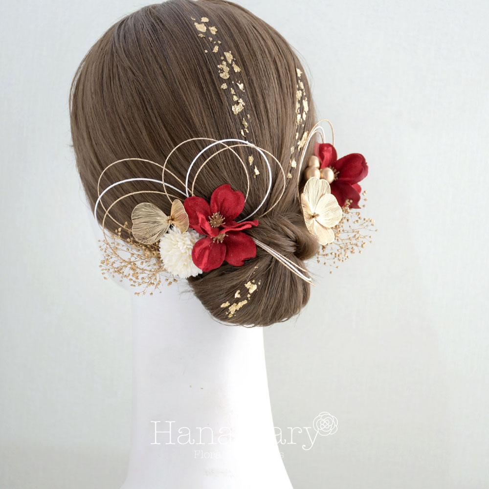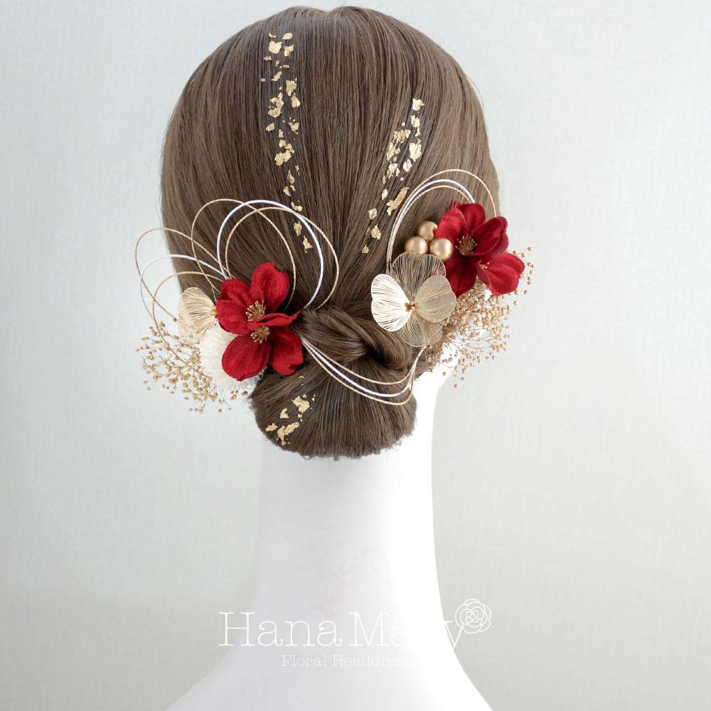 ベロア素材のハナミズキ 髪飾り 成人式 卒業式 結婚式【赤 ゴールド】