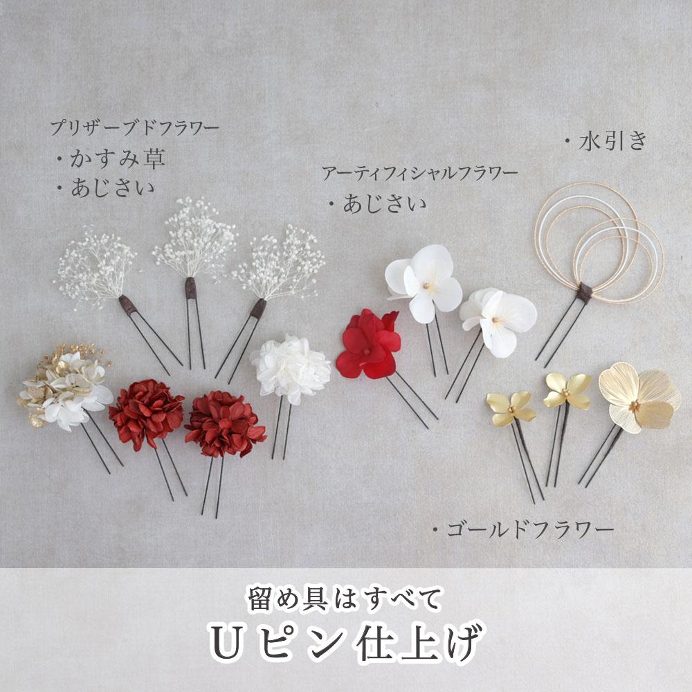 プリザのお花に加えて、ゴールドの花芯が可愛らしいアートフラワーのあじさいと、光の反射が可愛らしいメタル素材のお花をアクセントに使い上品に、より着物に似合うようアレンジされた髪飾りとなっております。