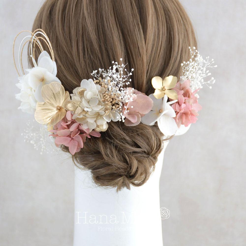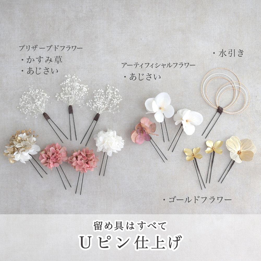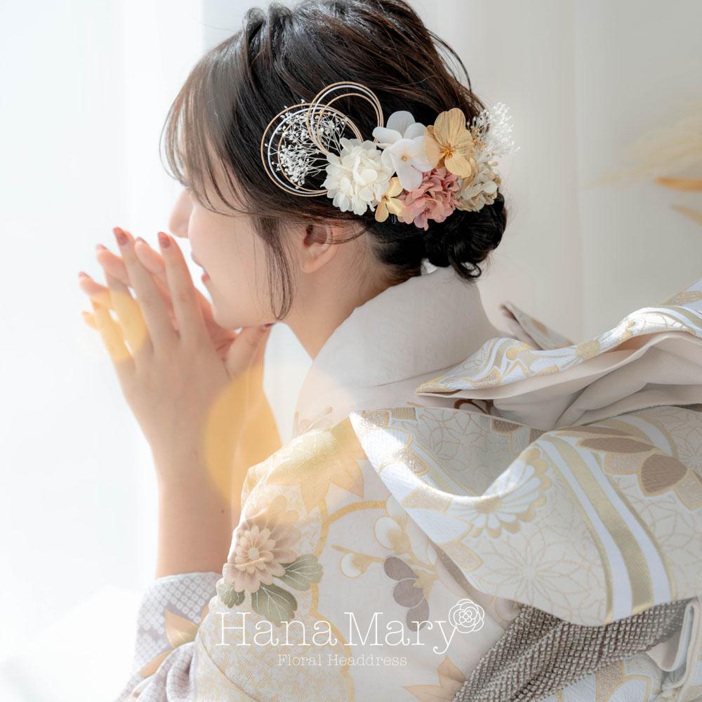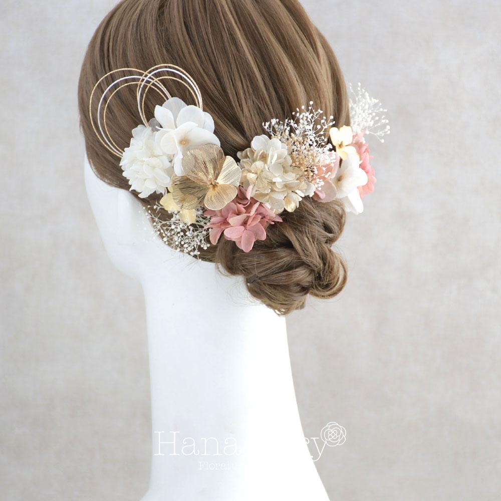 プリザのお花に加えて、ゴールドの花芯が可愛らしいアートフラワーのあじさいと、光の反射が可愛らしいメタル素材のお花をアクセントに使い上品に、より着物に似合うようアレンジされた髪飾りとなっております。
