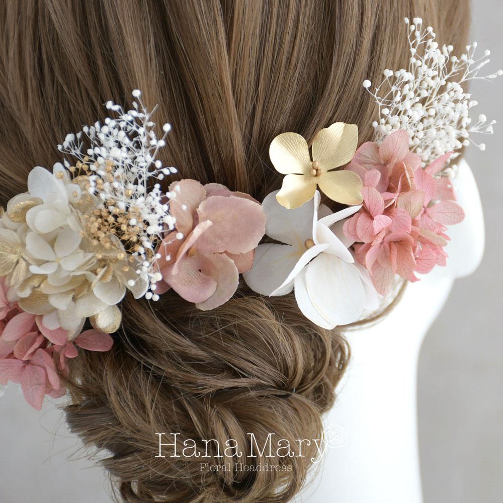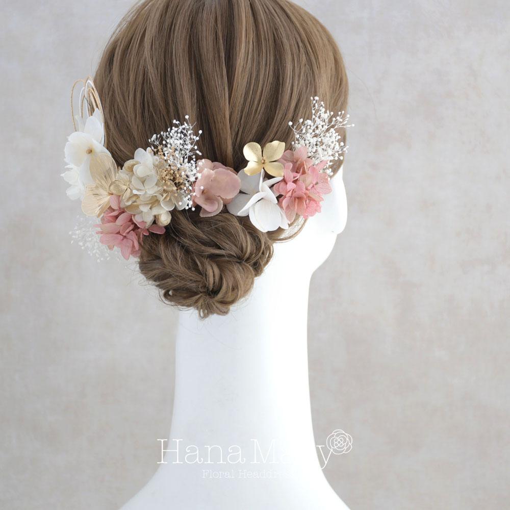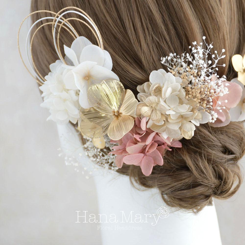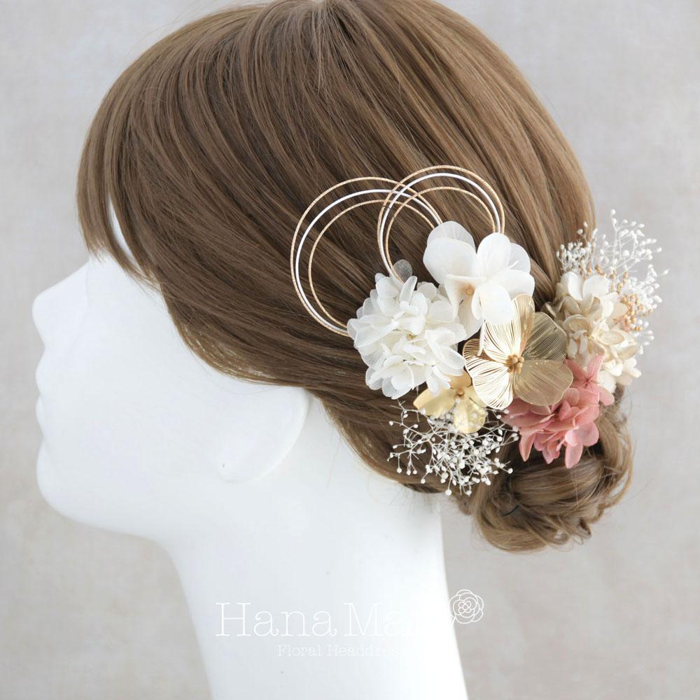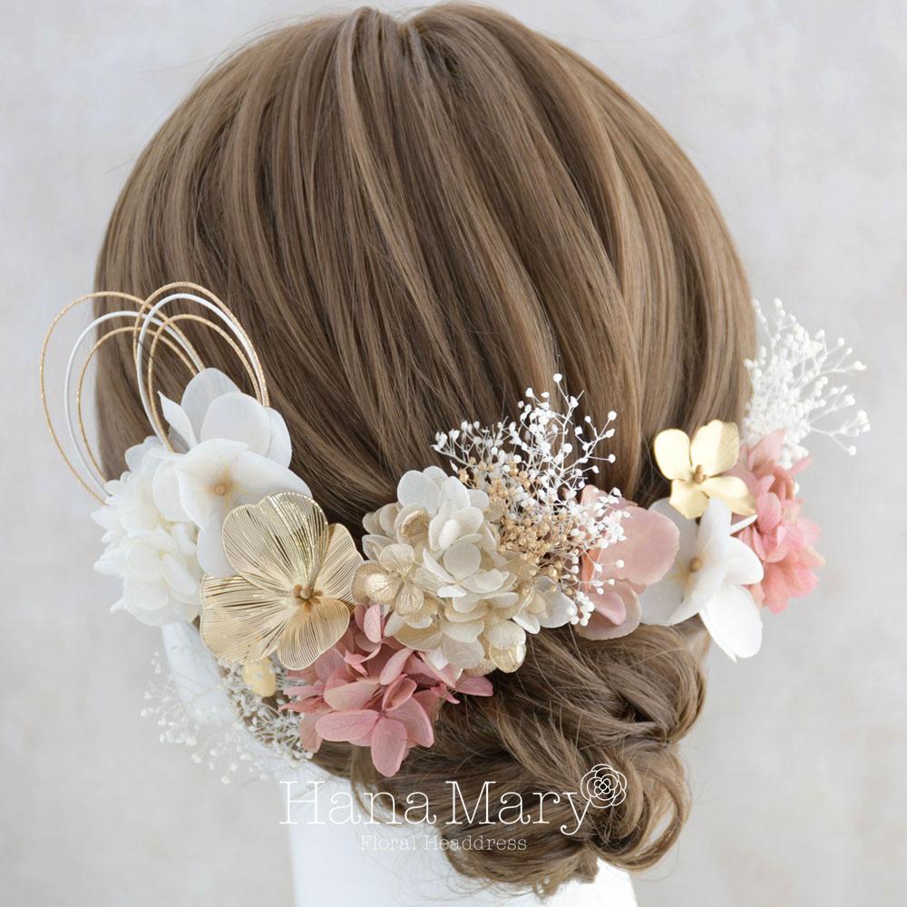 プリザのお花に加えて、ゴールドの花芯が可愛らしいアートフラワーのあじさいと、光の反射が可愛らしいメタル素材のお花をアクセントに使い上品に、より着物に似合うようアレンジされた髪飾りとなっております。