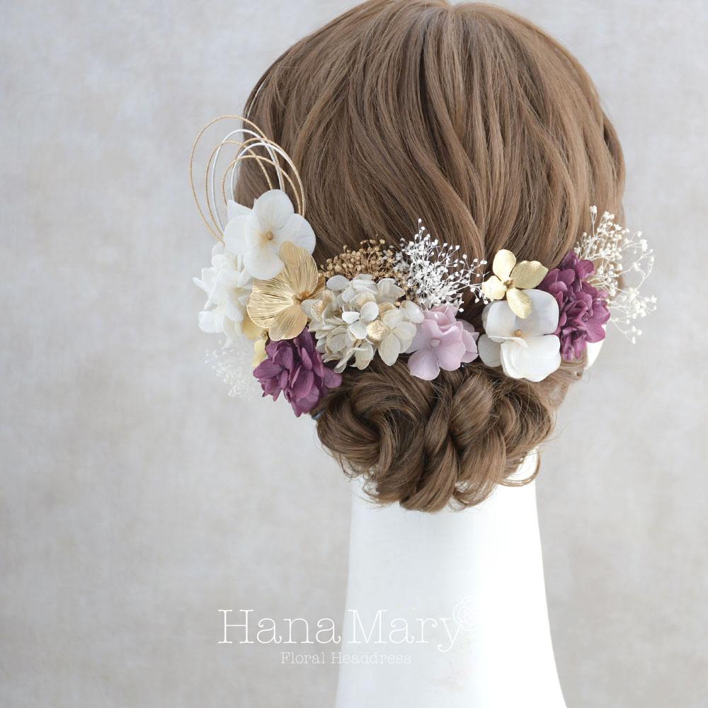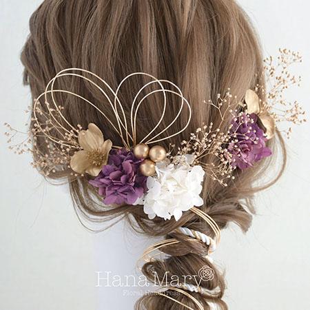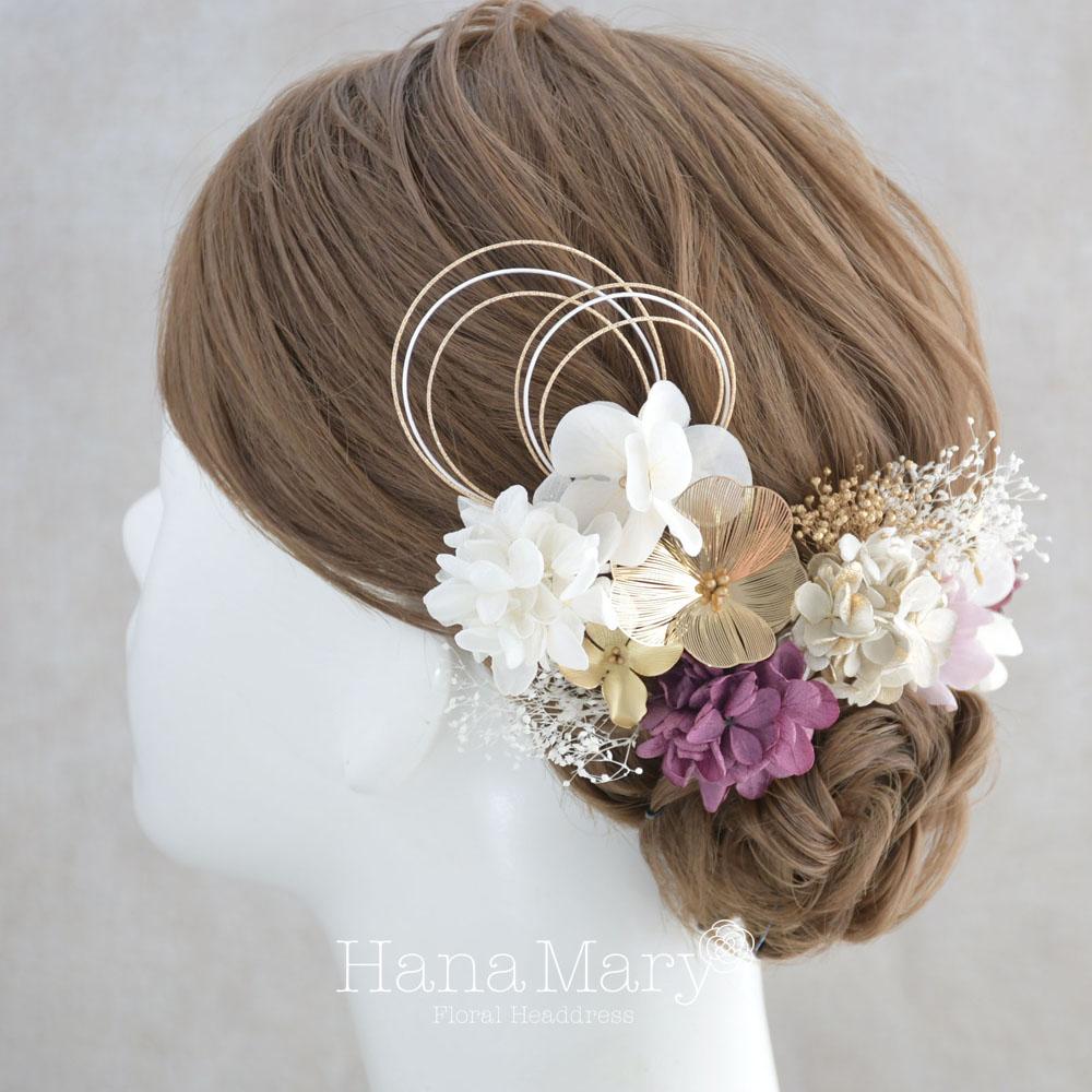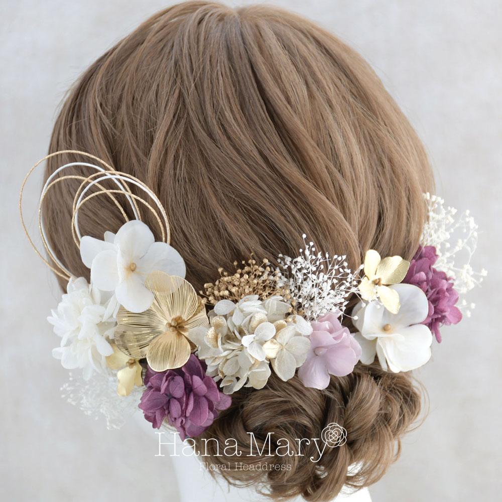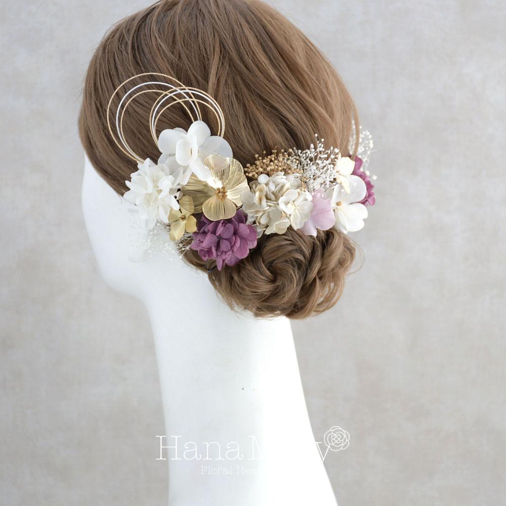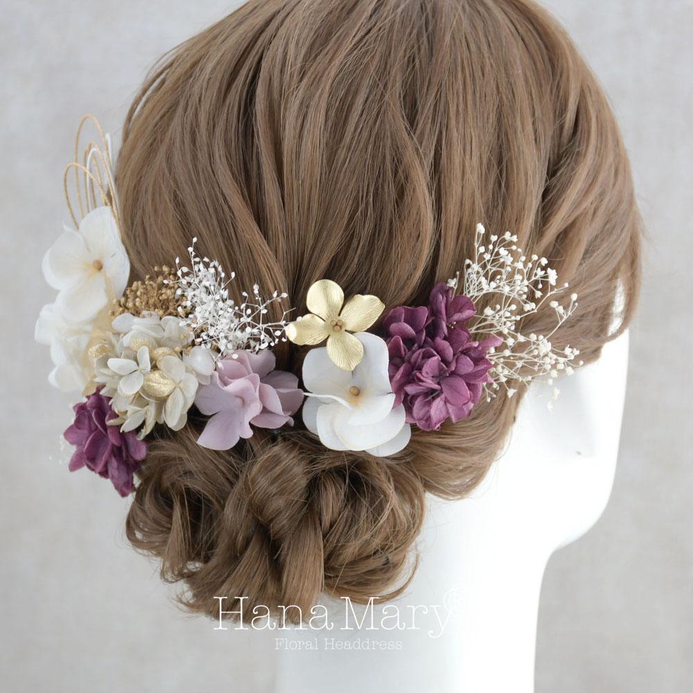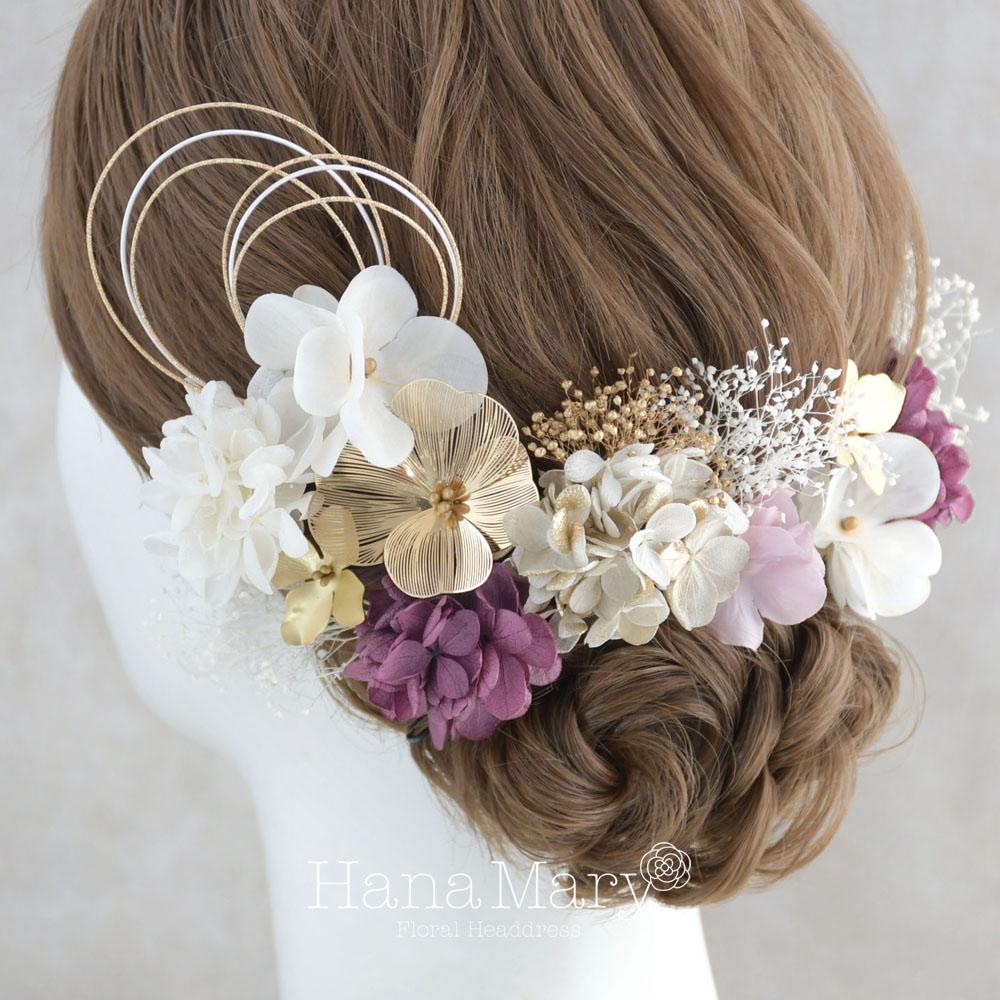 小花華やぐプリザの髪飾り 成人式 卒業式 結婚式【紫】振袖 袴 着物 水引き