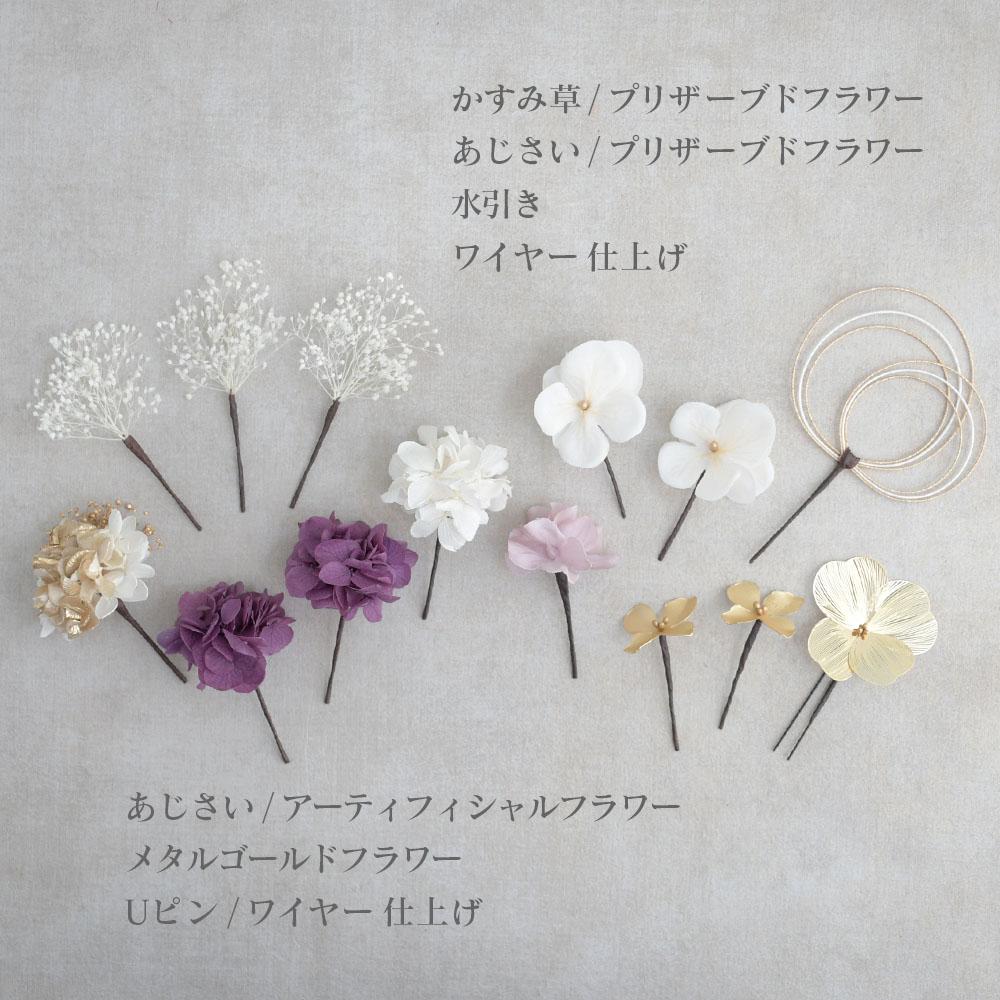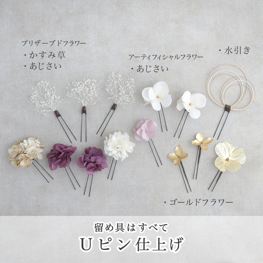 プリザのお花に加えて、ゴールドの花芯が可愛らしいアートフラワーのあじさいと、光の反射が可愛らしいメタル素材のお花をアクセントに使い上品に、より着物に似合うようアレンジされた髪飾りとなっております。