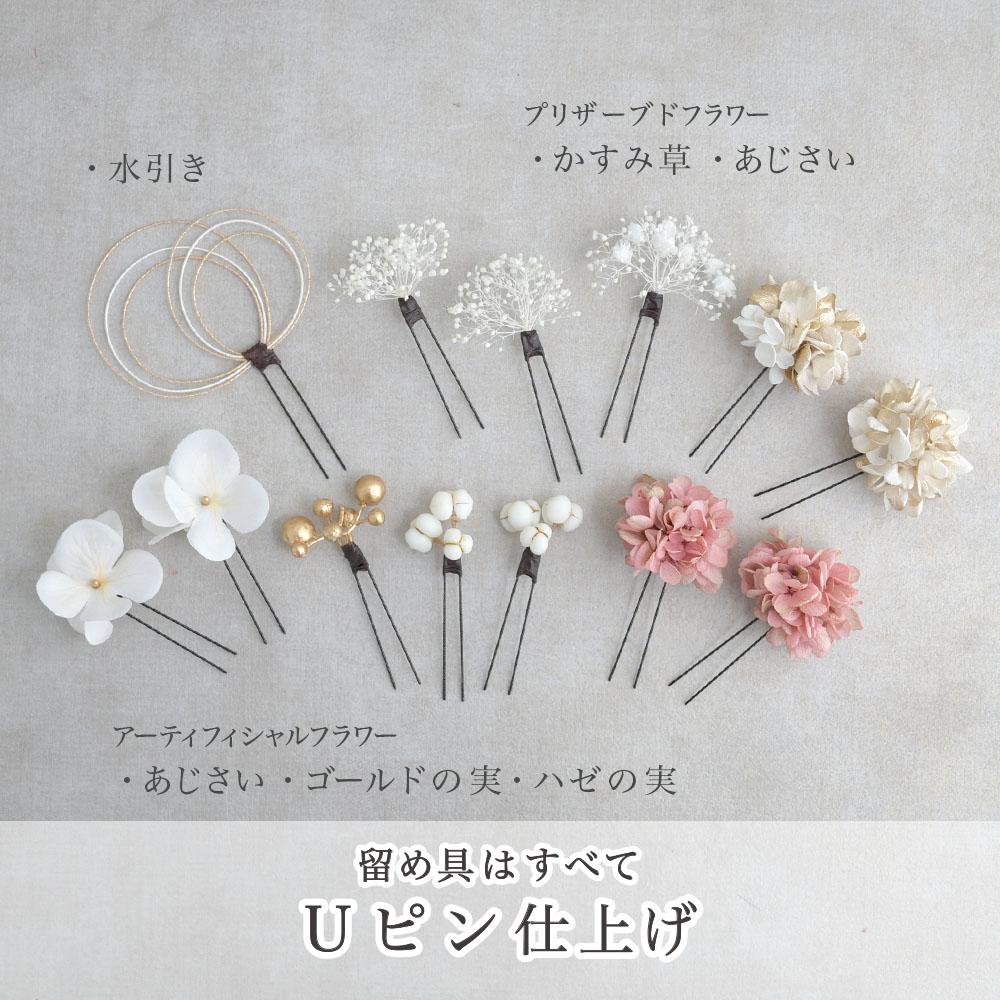 その日のヘアスタイルによって自由に一輪一輪配置できます。お花の数が多い場合でも、アメピンを追加して簡単にしっかりと固定できます。