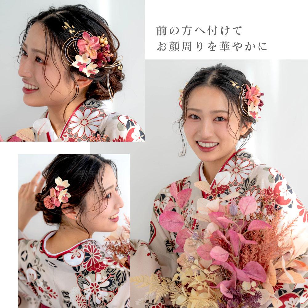 その日のヘアスタイルによって自由に一輪一輪配置できます。お花の数が多い場合でも、アメピンを追加して簡単にしっかりと固定できます。