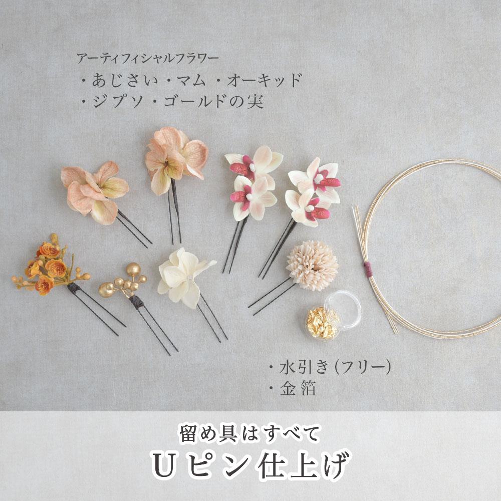 その日のヘアスタイルによって自由に一輪一輪配置できます。お花の数が多い場合でも、アメピンを追加して簡単にしっかりと固定できます。