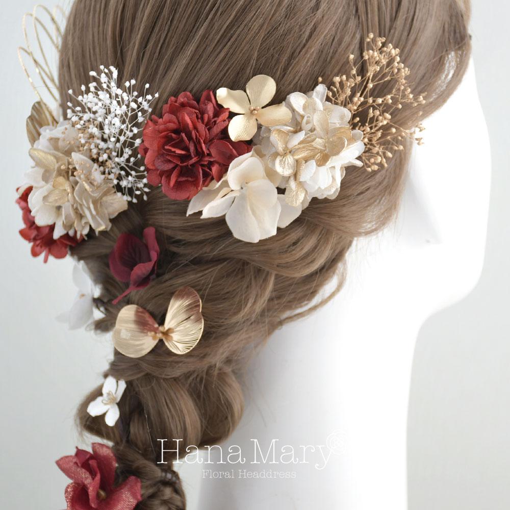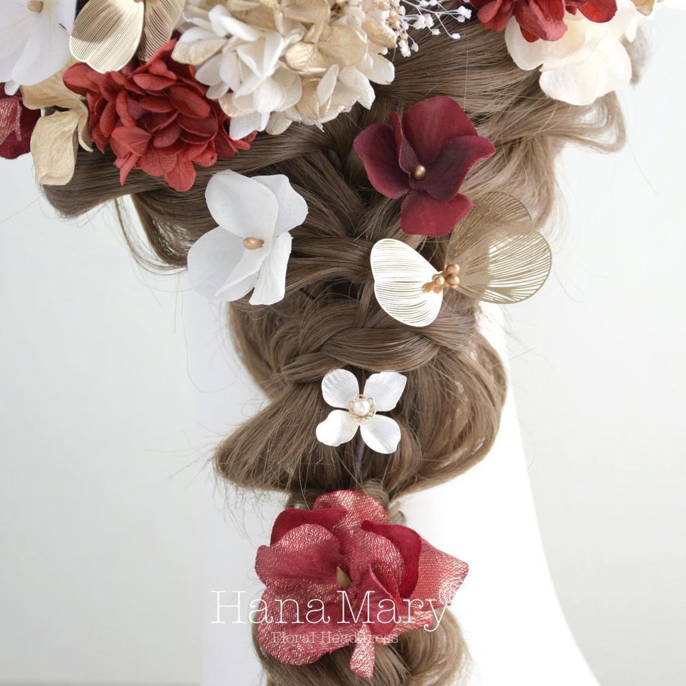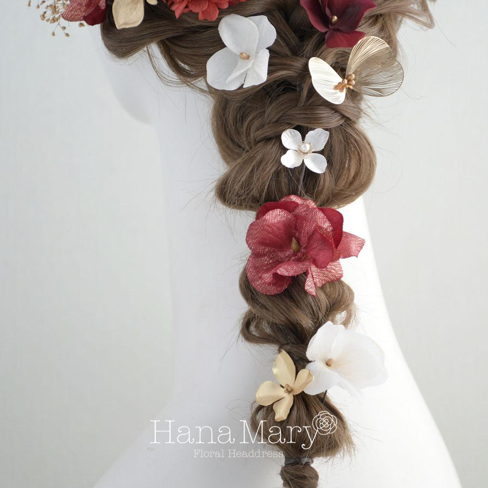 HanaMaryの髪飾りは生花をリアルに再現したアートフラワーと呼ばれるハイクオリティーな造花を使用しています。耐久性に優れ、成人式・卒業式やウェディングなどに何度でも繰り返し使用することができます。