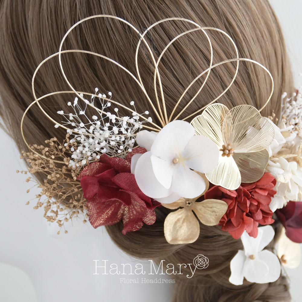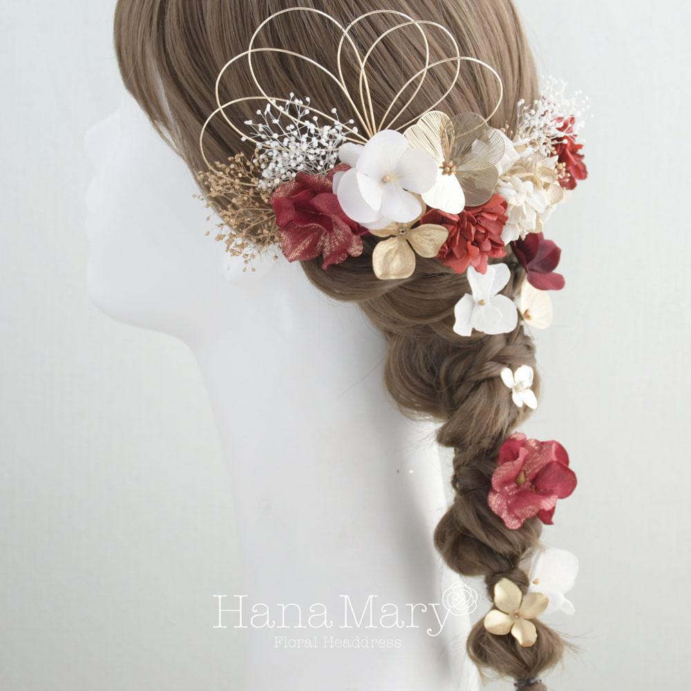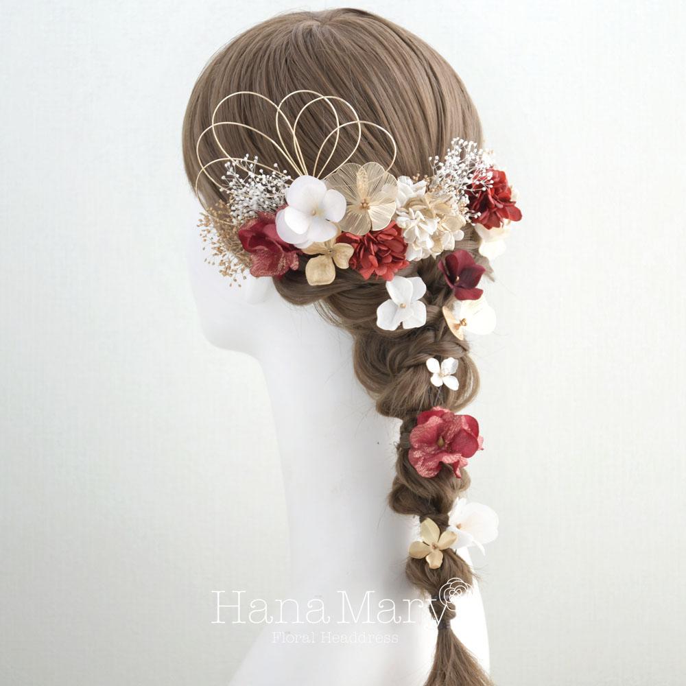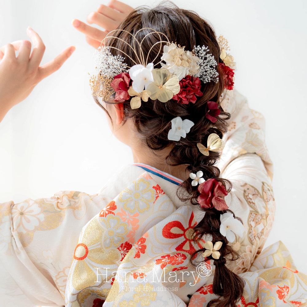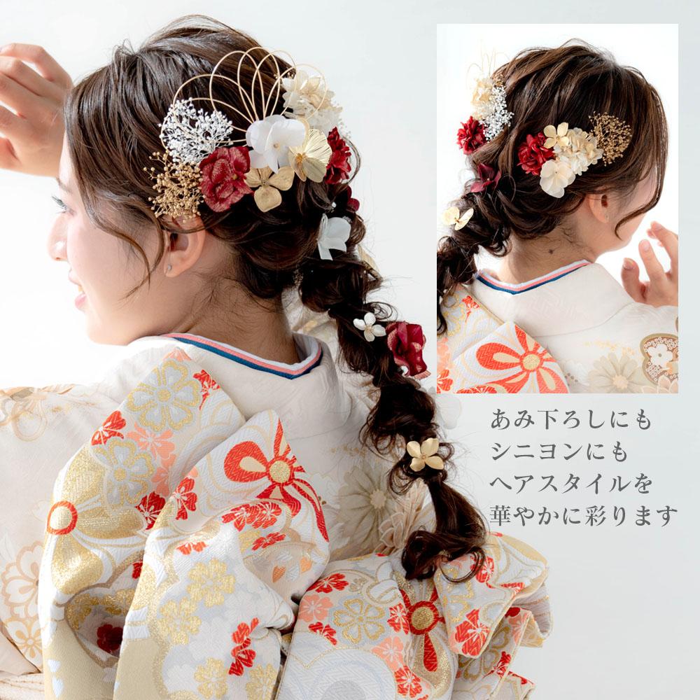あみ下ろしを華やかに プリザの髪飾り成人式 卒業式 結婚式【お祝い紅白】