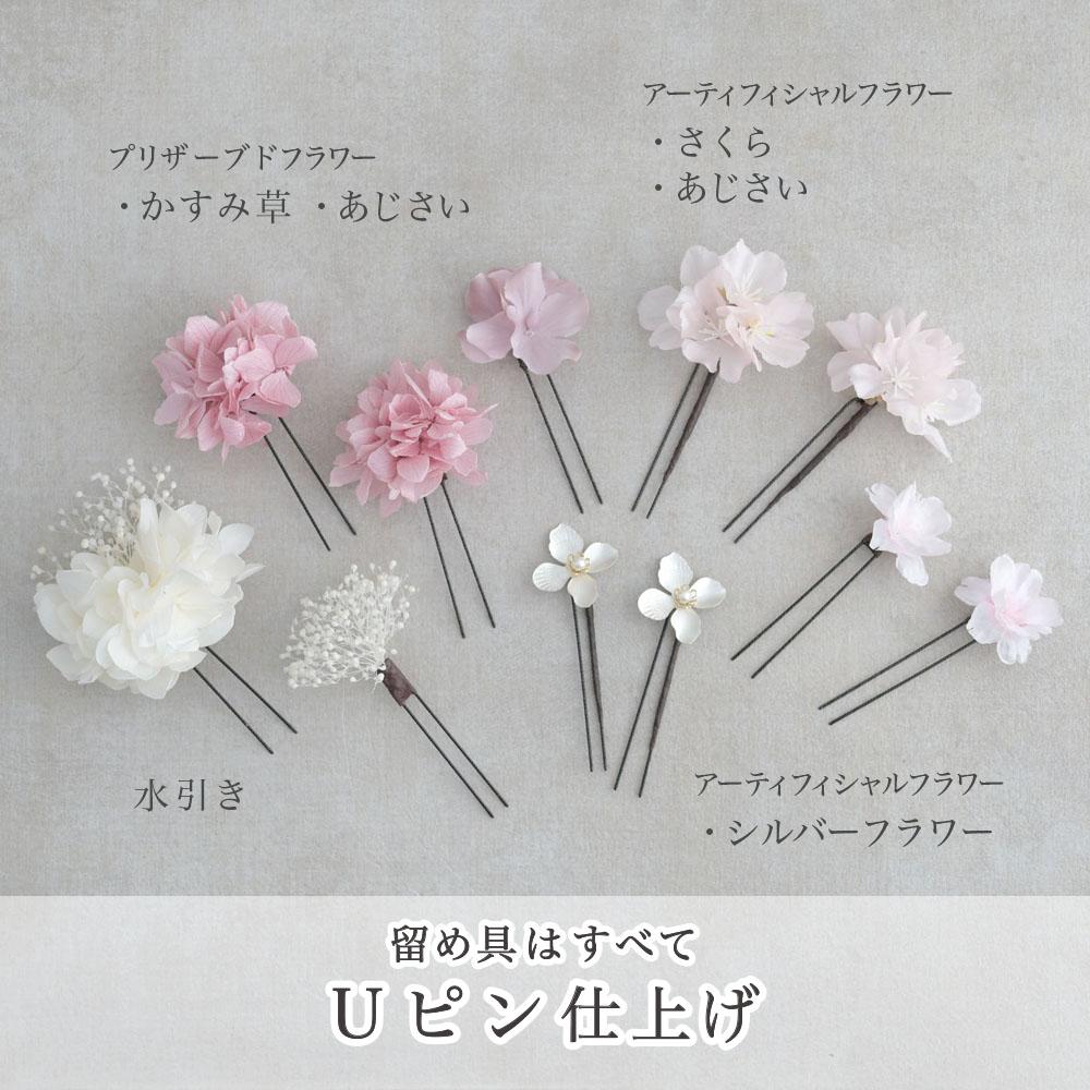 その日のヘアスタイルによって自由に一輪一輪配置できます。お花の数が多い場合でも、アメピンを追加して簡単にしっかりと固定できます。