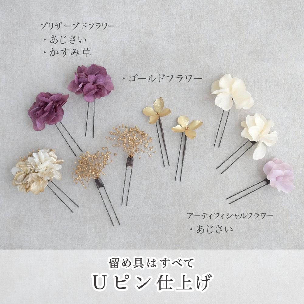 その日のヘアスタイルによって自由に一輪一輪配置できます。お花の数が多い場合でも、アメピンを追加して簡単にしっかりと固定できます。