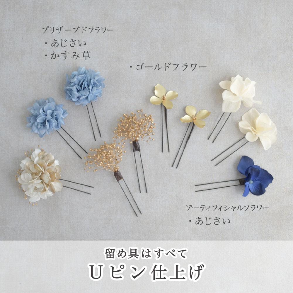 その日のヘアスタイルによって自由に一輪一輪配置できます。お花の数が多い場合でも、アメピンを追加して簡単にしっかりと固定できます。