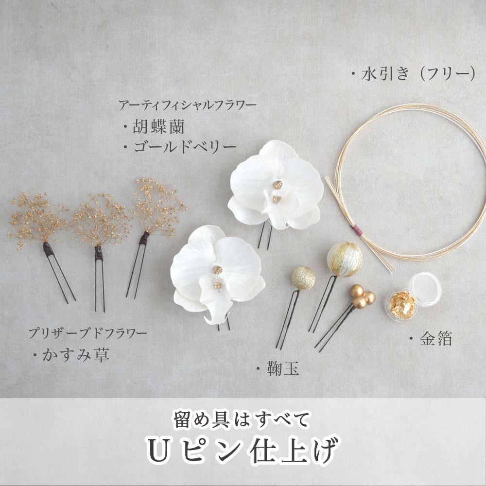 その日のヘアスタイルによって自由に一輪一輪配置できます。お花の数が多い場合でも、アメピンを追加して簡単にしっかりと固定できます。