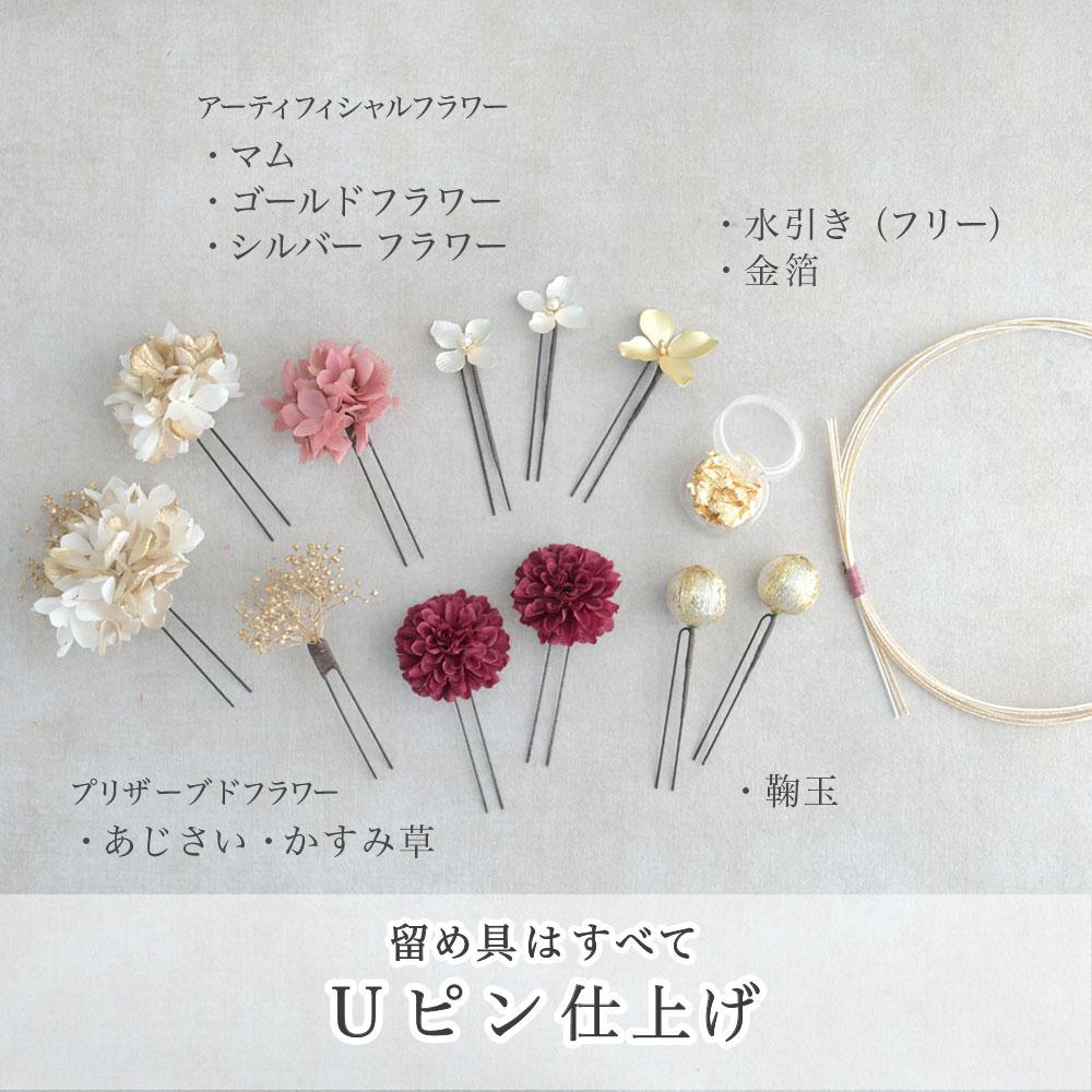その日のヘアスタイルによって自由に一輪一輪配置できます。お花の数が多い場合でも、アメピンを追加して簡単にしっかりと固定できます。