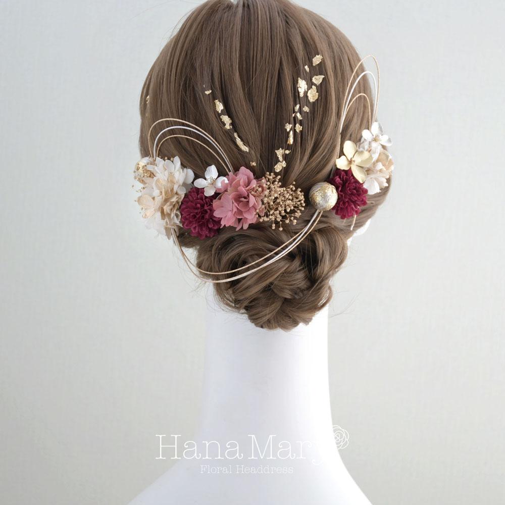 シックなボルドーカラーにゴールドを組み合わせて大人っぽくも華やかな印象に。卒業シーンの袴とも相性良きです。
