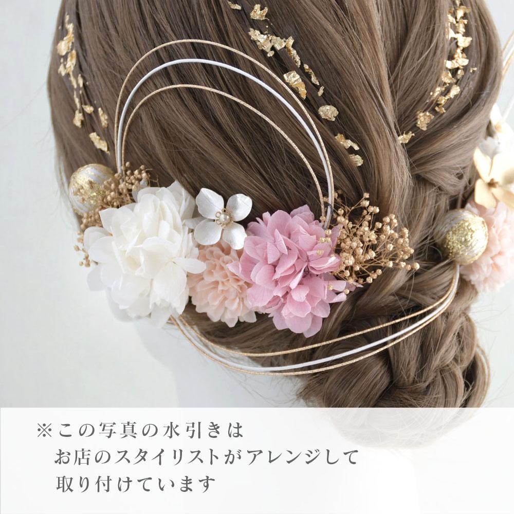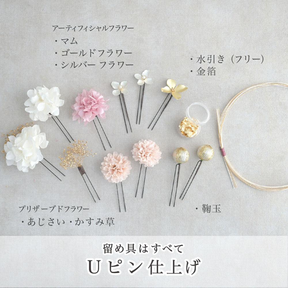 その日のヘアスタイルによって自由に一輪一輪配置できます。お花の数が多い場合でも、アメピンを追加して簡単にしっかりと固定できます。