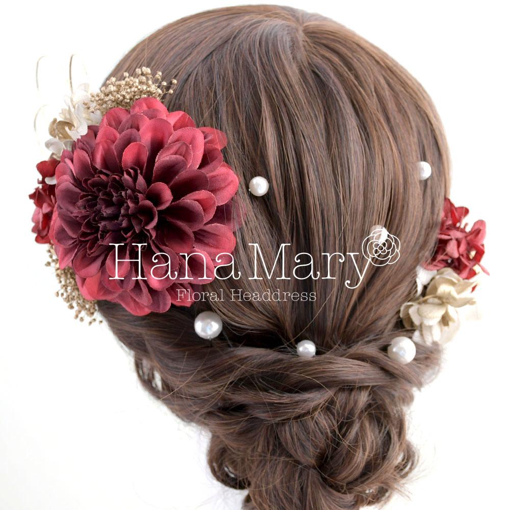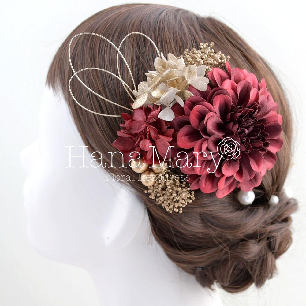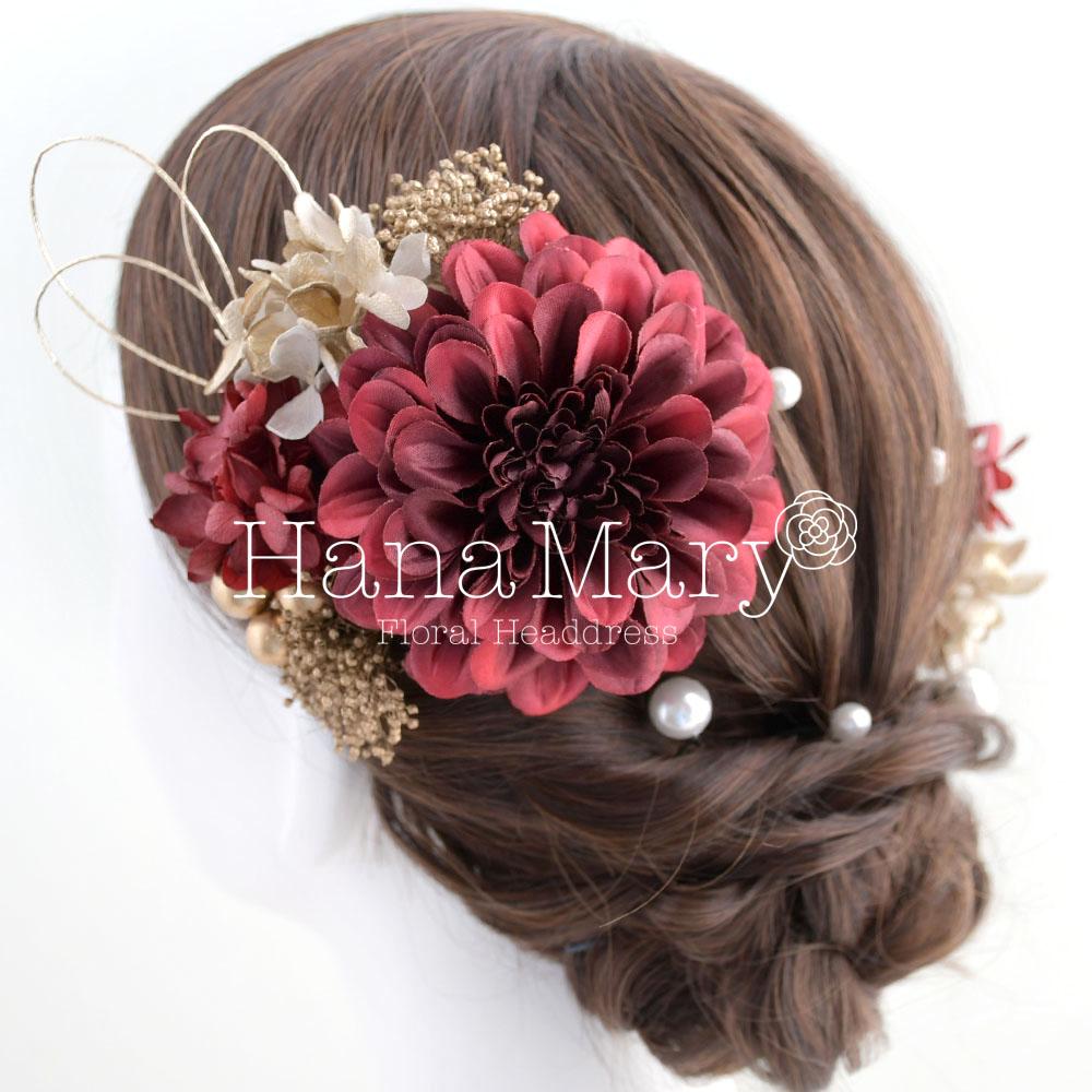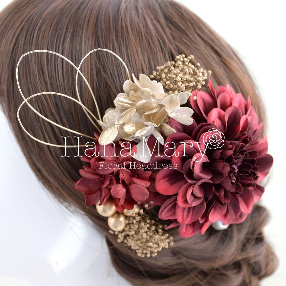 濃赤ジニアをゴールドでシックに華やかに 成人式 卒業式 結婚式 髪飾り