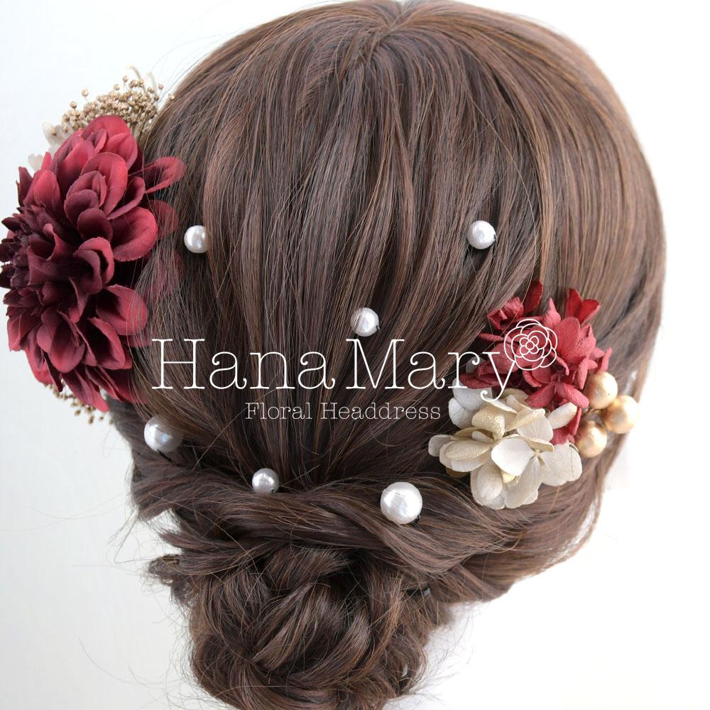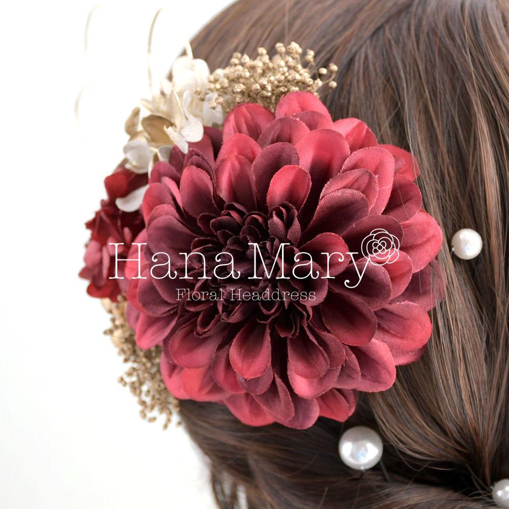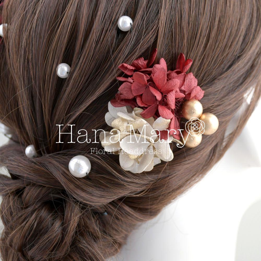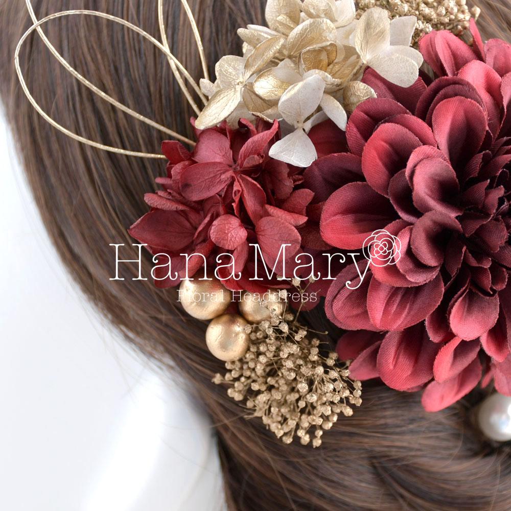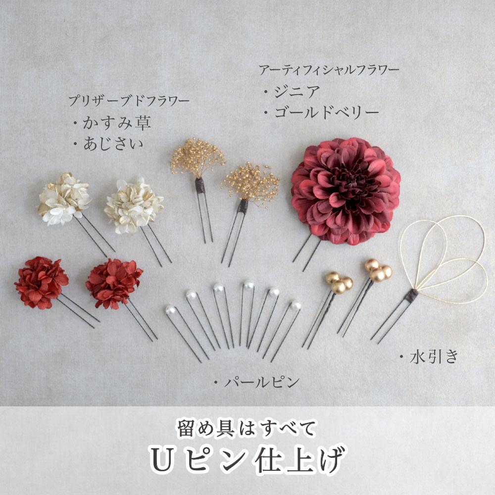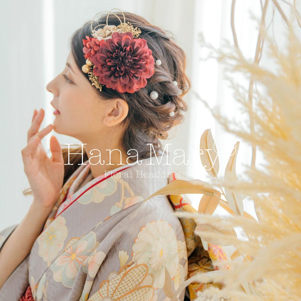 メインとなるジニアのお花の花弁の赤はディープな深みのある真紅色。お祝いカラーの紅白色の髪飾りをHanaMaryのデザイナー陣がよりシックでエレガントに魅せる一押しのアレンジです。
