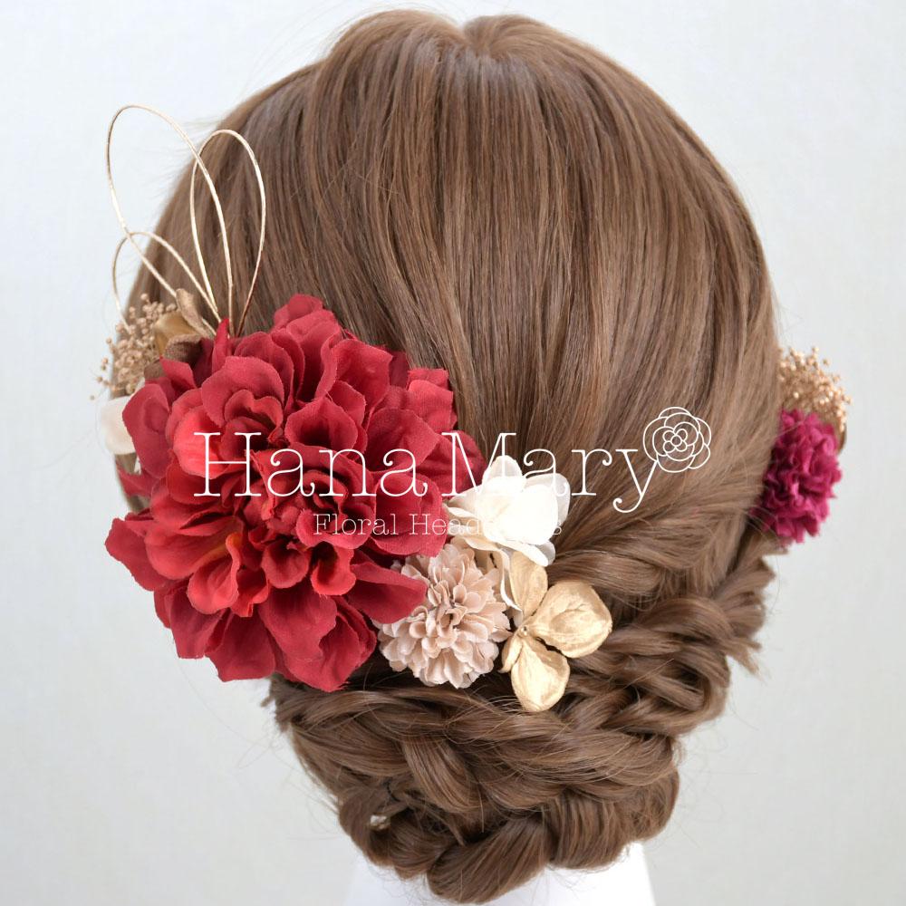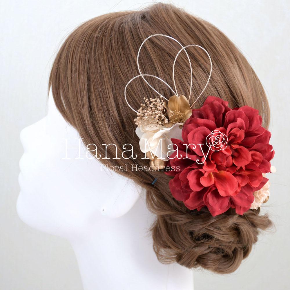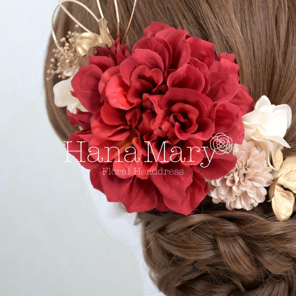 ダリアにゴールドを添えて【赤】成人式 卒業式 結婚式 髪飾り 袴 振袖 着物