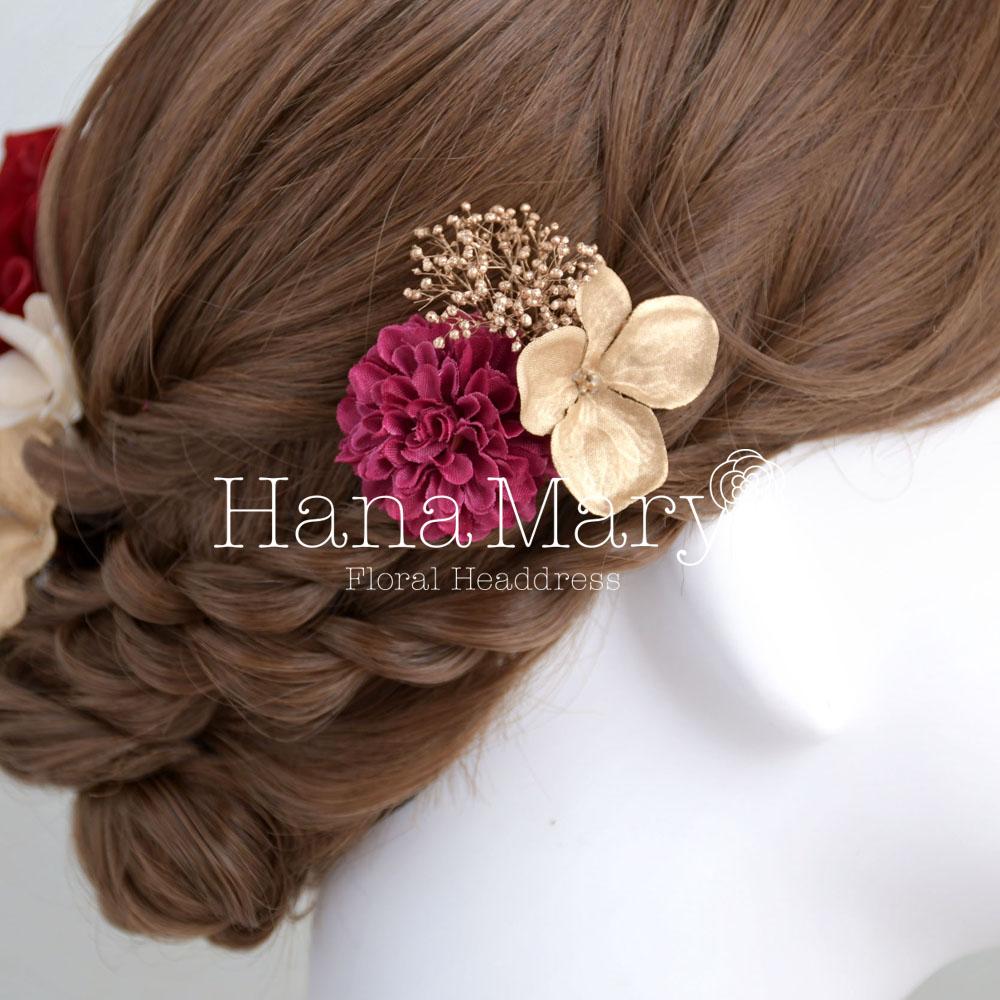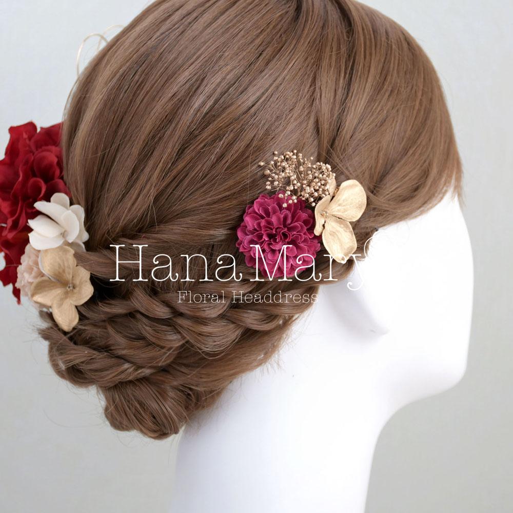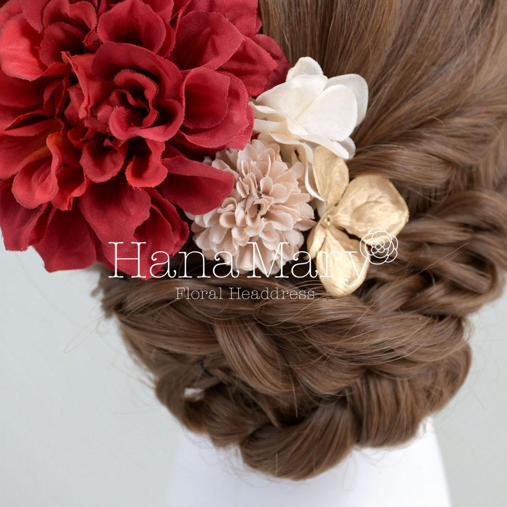 ベーシックに使いやすい赤色のダリアに、ゴールドパーツを取り入れたクラシカルモダンな髪飾り。